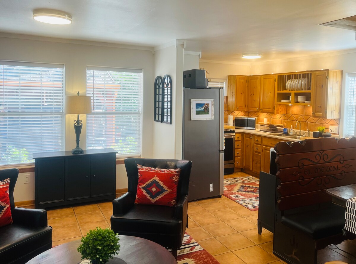 Welcome to Native Sun in Medicine Park! This unit has been a family favorite and is located above our private garage in the heart of Medicine Park. Decked out in Native American style with a deck to enjoy coffee in the morning or sunsets in the evening. Small kitchenette w/ two burner range and Toshiba Microwave Air Fryer Oven combo can accommodate small cooking needs. Full bathroom with tub, smart TV, and WiFi are just some of the amenities you will enjoy during your stay. NOT PET FRIENDLY