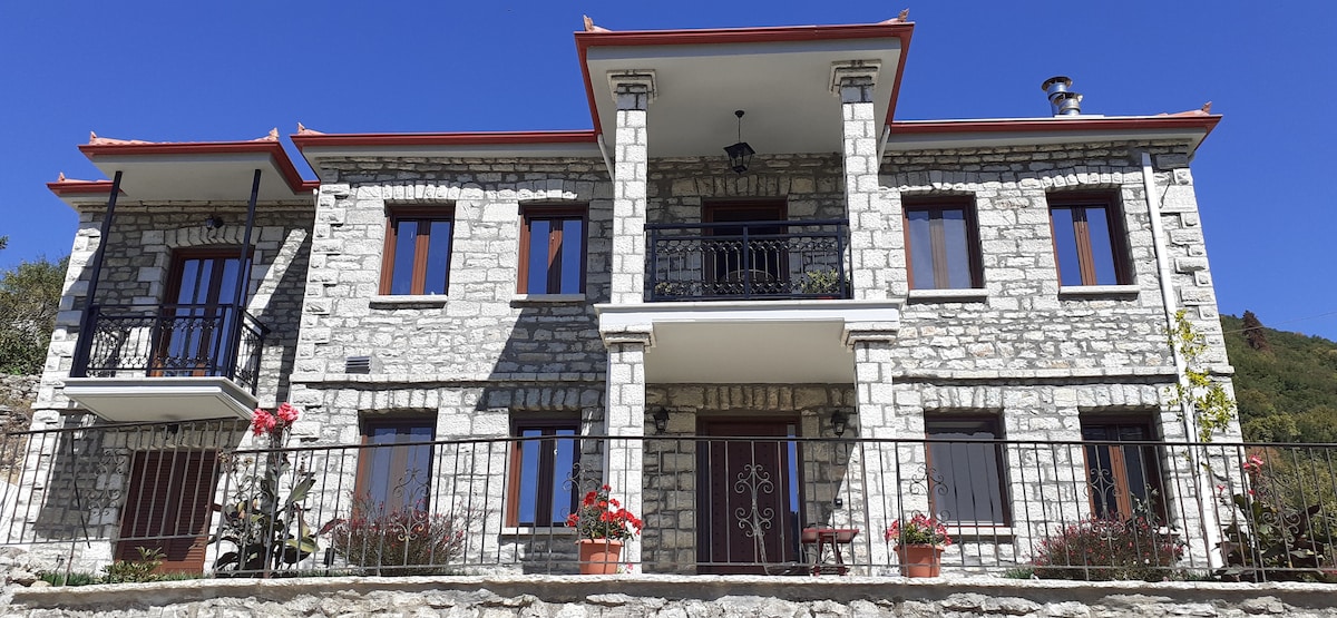 Ev gözəl yeni Mikro Çorionun mərkəzində, kənd meydanına və Ölkə Klubuna çox yaxın, Kaliakouda və Velouçiyə baxan Çlidonanın ətəyində xəyalpərəst bir mühitdə yerləşir. Daş və taxtadan hazırlanmış ənənəvi arxitektura ilə tikilib. Birinci mərtəbədə iki müstəqil evdən, biri isə birinci mərtəbədə bir müstəqil evdən ibarətdir. Mənzilin birinci mərtəbəsində qonaq otağı, mətbəx ,yataq otağı və hamam otağı var.