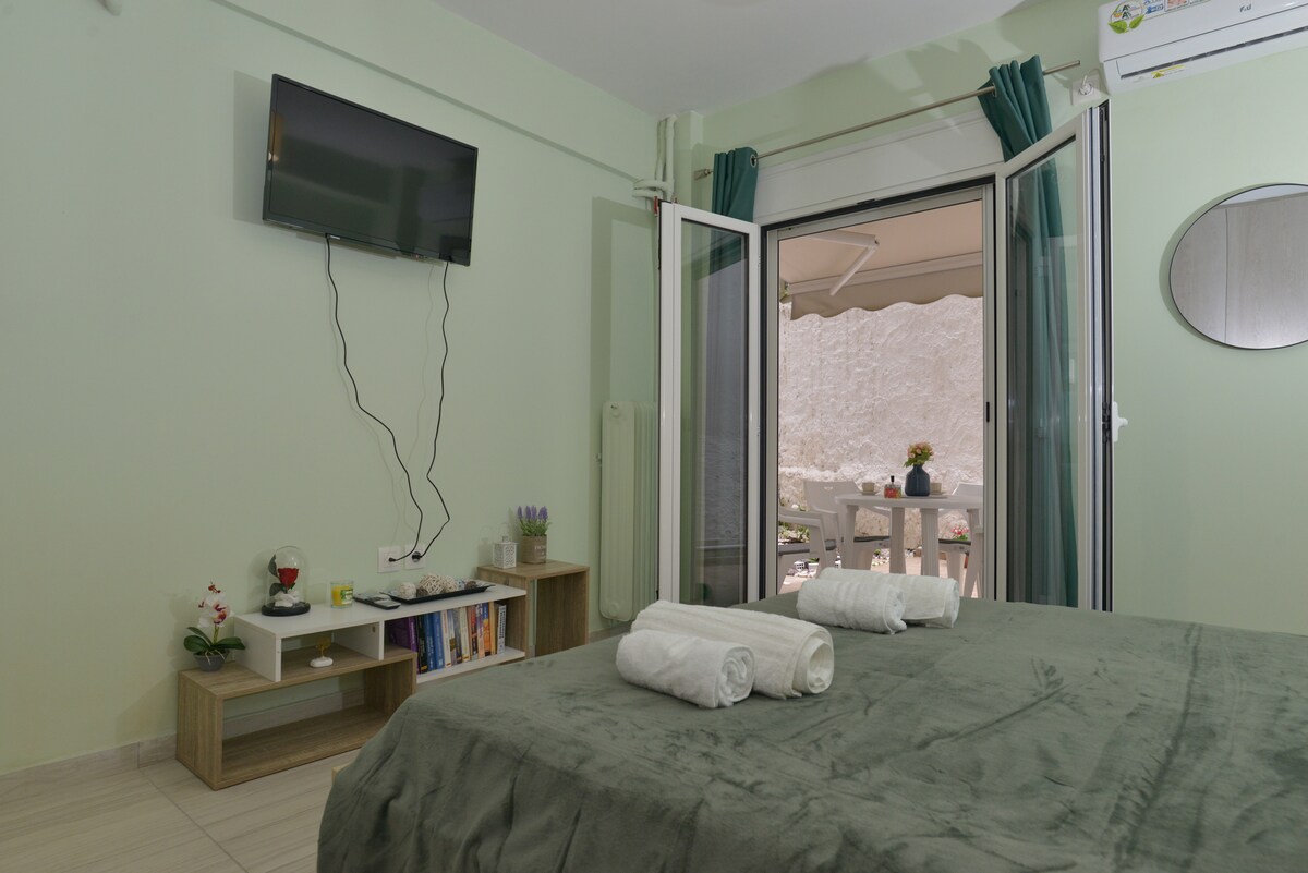 Afina mərkəzindəki sakit küçədə və hava limanına gedən metro xəttinin yaxınlığında yerləşən bu təmir edilmiş üst mərtəbə qısa gəzinti fasilələri və bədnam Afina atmosferini hiss etmək üçün və ya daha uzun səfərlər üçün mükəmməldir. Rahatlıq və üslubda.