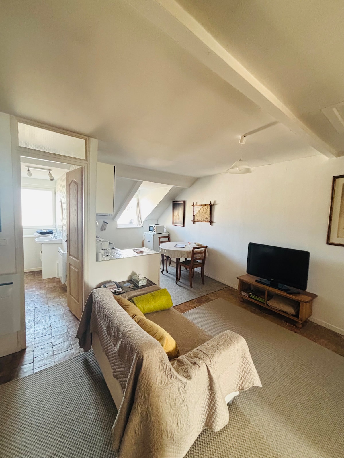 Caenin tarixi mərkəzində, şəhər meriyasının və kişi abbatlığının yanında 65m2-lik tam təmirli köhnə mənzil, həyətdə və bağda işıqlı döşəmə, o cümlədən tam təchiz olunmuş açıq mətbəx, divan çarpayısı olan qonaq otağı, iki yataq otağı, duş və vanna otağı. Qapalı və günəşli bağa baxan cənuba baxan terras, həyətdə parkinq mümkündür. Televizor, Wi-Fi, ütü masası və ütü, saç feni, dəsmallar və yataq dəsti təmin edilib.