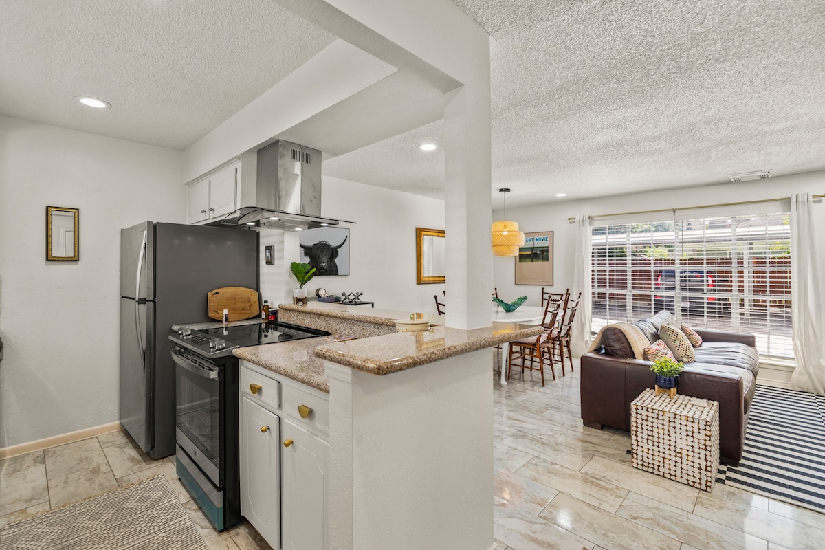 Tranquil top floor studio with skyline views in a prime central location. Bright, quiet, and intentionally designed for rest and ease. Wake up to sunrise from the king bed and unwind in a calm, elevated space above the city. With over 300 stays, guests consistently mention the comfort, cleanliness, and how relaxed they feel here. Thoughtful hosting and a smooth, reliable stay. Secure parking included, with easy access to Downtown and the Heights.