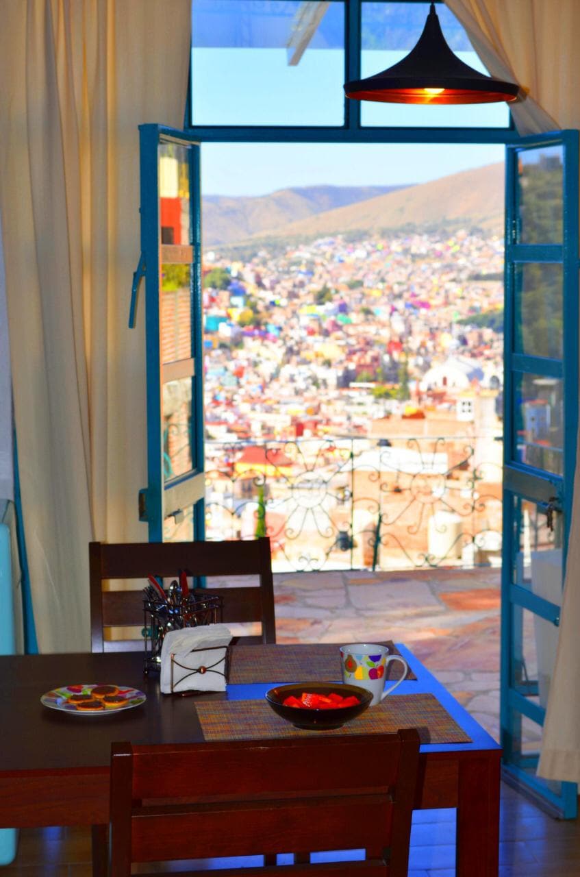 Perfectly located in the center of Guanajuato on colorful Tecolote, a tranquil PEDESTRIAN street only a few minutes walk uphill from plentiful restaurants, bars, theaters and activities. This private studio offers a spectacular view, beautiful old world charm and modern conveniences; including memory foam mattress, quality bedding, unlimited hot water, and an equipped kitchenette with filtered water. The inviting, planted terrace has a cozy seating area to enjoy the incredible VIEWS.