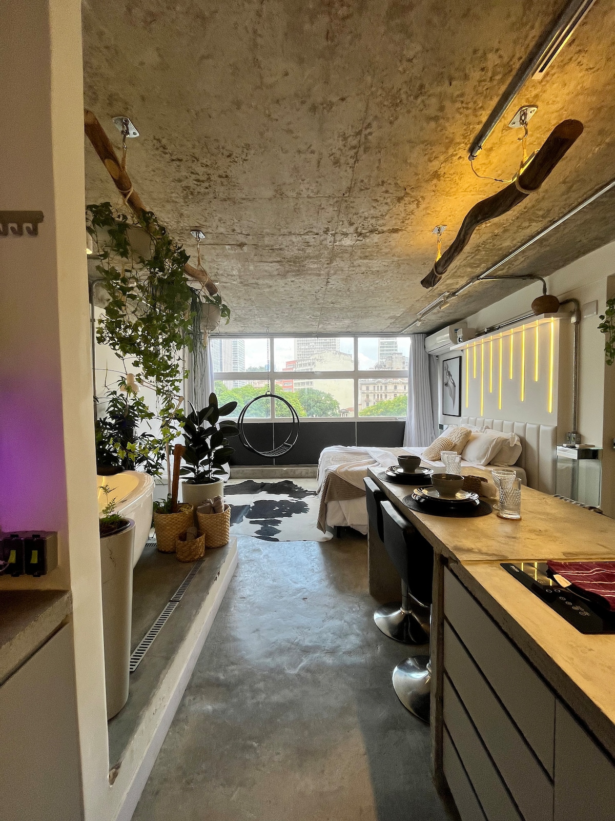 Estúdio industrial de 35m² no 39º andar, com vista panorâmica do Vale do Anhangabaú. Ambiente moderno com concreto, tijolos à vista, madeira, metal e mural exclusivo de Caio Fonseca trazendo identidade e autenticidade ao ambiente. Próximo a bares, restaurantes, rota gastronômica da República e comércio popular e teatros / museus / centros culturais. Ideal para casais, fotógrafos e nômades digitais que buscam conforto e estilo no centro de São Paulo.