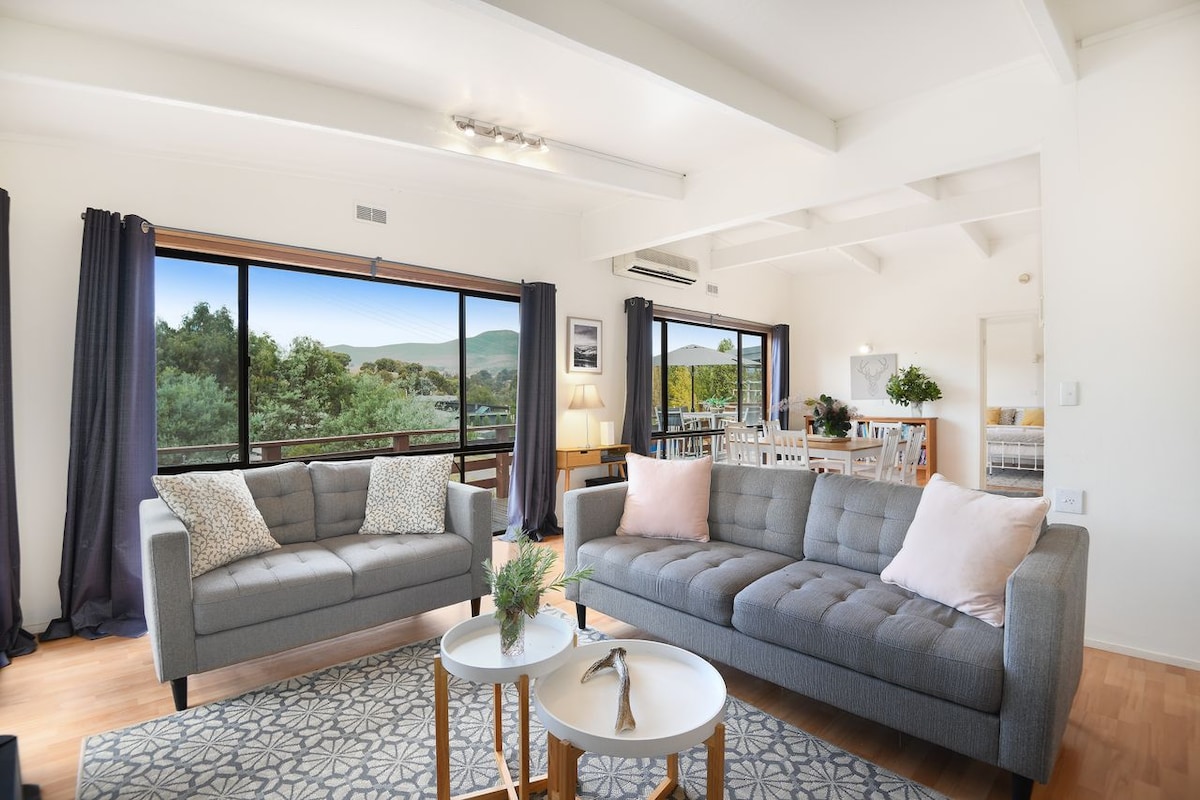 Kick back and relax in this pet friendly, peaceful & stylish space. 2 bedroom home with queen beds, a double bed and leather couch - should you need an extra bed. The home has a massive outdoor dining area with fire pit & BBQ. Inside is a split system for heating/cooling and a coonara fireplace for cold, wintry weather. Firewood can usually be purchased from the Bonnie Doon service station. Views from every window, a 10 minute drive to the local pub (dogs welcome) and lake. Come and enjoy!