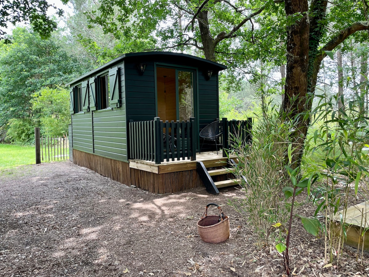 Roulotte dans la forêt des Landes. Proche lac d'Azur (2 kms), proche plage de Soustons, Messanges (10 kms). La roulotte se trouve dans un grand jardin. Vous pourrez profiter de la piscine (à voir avec nous) et de la cuisine d'été (plancha). Un grand enclos accueille 2 cochons de compagnie. Je serai ravie de vous accueillir et de vous aider si besoin.