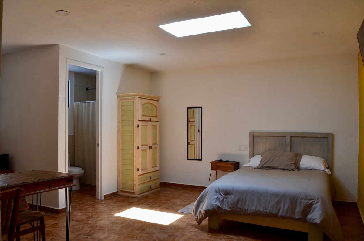 İş və istirahət üçün ideal olan peşəkarlar, rəhbərlər və ya kiçik ailələr üçün otaq. Toluka Hava Limanından 15 dəqiqəlik məsafədə mühüm ticarət mərkəzlərinə və Santa-Fe və CDMX-yə ən vacib giriş yollarına yaxın, 24/7 təhlükəsizliyi olan yaşayış yeri. Məkanda iki yataq otağı (biri birinci mərtəbədə, biri isə yuxarı mərtəbədə), hamam otağı, iş sahəsi və süitanın qapısında parkinq yeri var. Şəhər meydanından və Pueblo Mágico de Metepec-in tipik mərkəzindən 8 dəqiqəlik məsafədə.