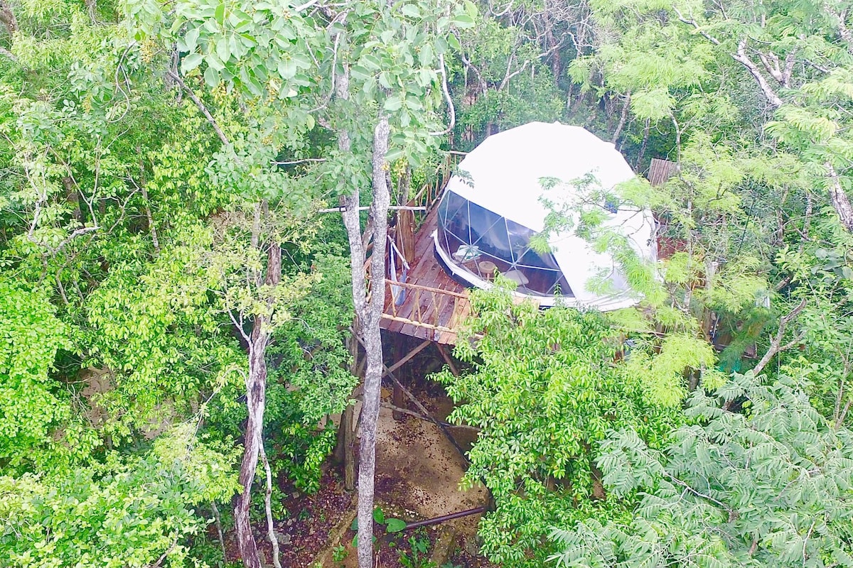 No availability? Other treehouses on Host Profile. Enjoy this unique Jungle Treehouse Experience in the tree tops. The Canopy treehouse is intentionally elevated (height: 6 Mts/20ft) and shaped amongst the trees. A spacious Eco dome gives you all the comfort of Glamping: King bed, private bathroom & HIGH SPEED fan. Relax in nature, swing the hammock enjoying the views or gaze at the stars. The property is located 10-15 MIN DRIVE from different beaches of Tulum & a short stroll to nearby cenotes!