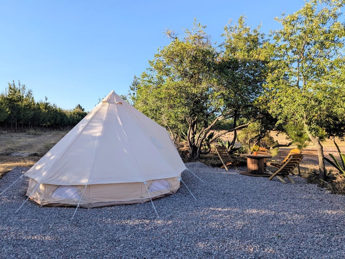 Enjoy an elevated glamping experience in Pátzcuaro, where comfort meets nature and tradition. This VIP bell tent offers a more exclusive setting, ideal for couples seeking added privacy and relaxation. It features a queen bed, enhanced interior amenities, and a carefully curated atmosphere inspired by local cultural identity. Shared outdoor areas include a fire pit, open cinema, and green spaces, along with clean and functional communal bathrooms, all within a peaceful and authentic environment.