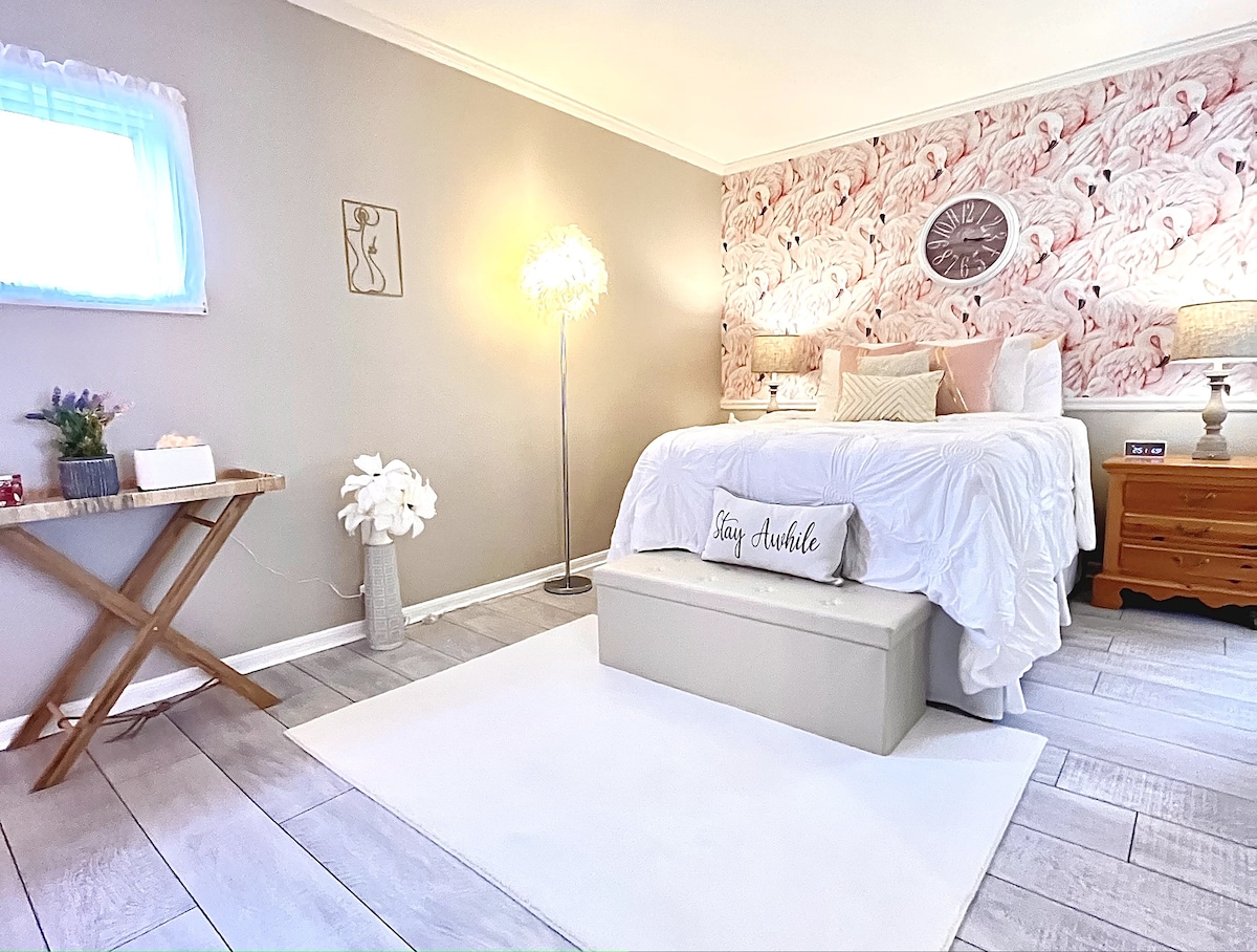 - Sleeps 4 (Queen bed & air mattress) -Heated towel/robe warmer, plush robes, microfiber hair wrap, makeup mirror -Coffee bar w/ french press, espresso machine, fresh coffee beans, flavored syrups, tea -Fully stocked kitchen w/ airfryer, baking essentials, toaster - Access to streaming services is provided (no cable TV) -Barware including cocktail shaker set, champagne flutes, margarita/wine/whiskey glasses -Complimentary toiletries & feminine oriented essentials -Indoor fireplace