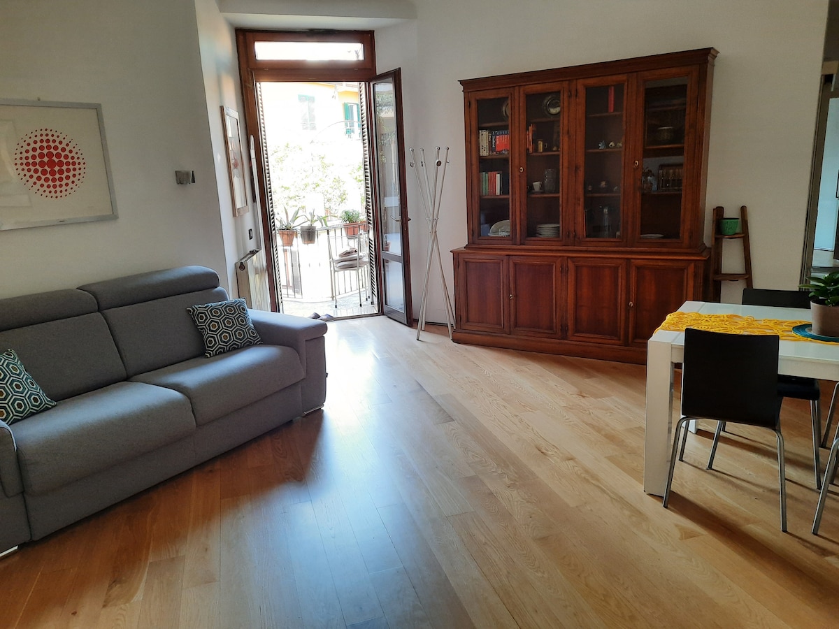 Wake up to the morning light in a historic building in Piazza Giovine Italia. High ceilings create a sense of space, while the living room, with wood paneling and a panoramic balcony, invites you to relax. The modern kitchen and dining area are perfect for intimate dinners, while the bedroom and spacious bathroom offer a serene retreat. A charming oasis where history and comfort meet, for an unforgettable stay.