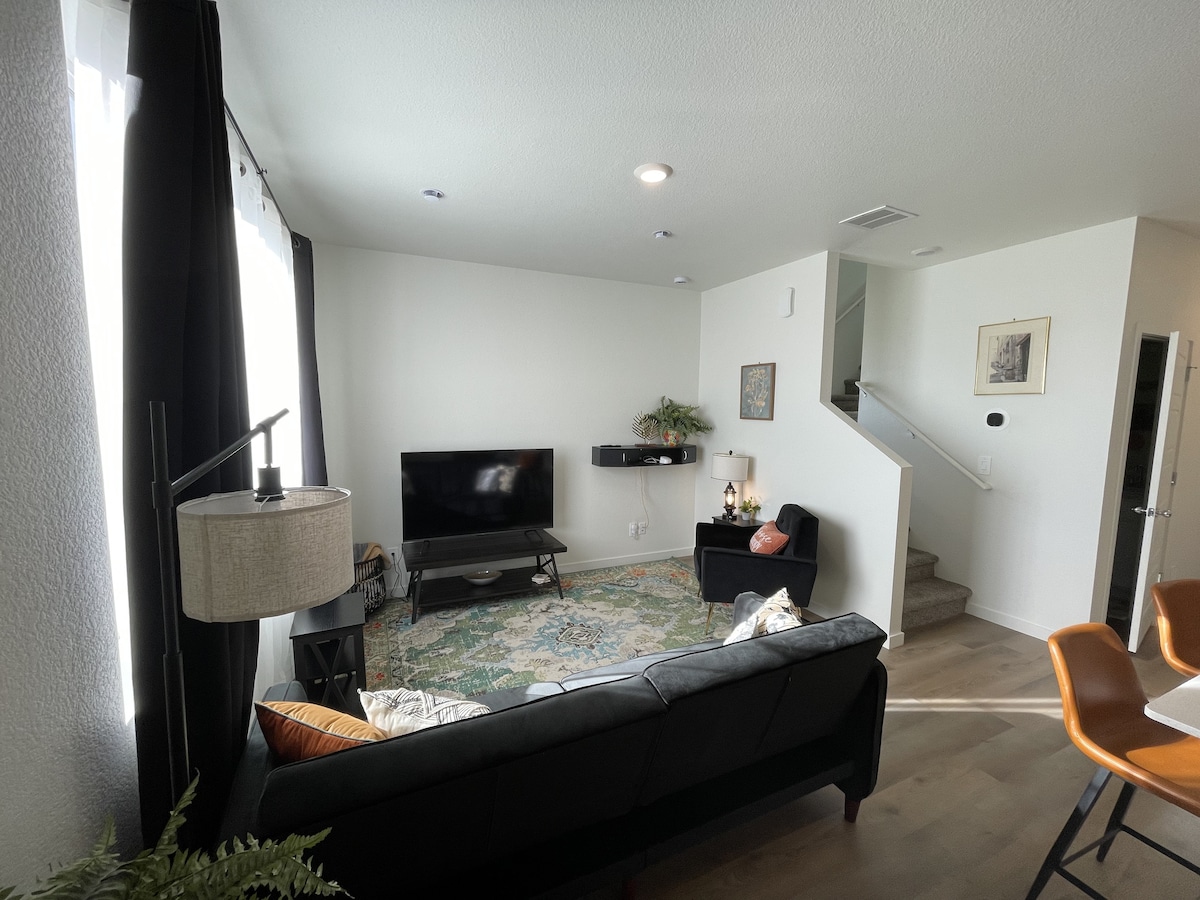 This unique place has a style all its own, it's a new build three bedroom, 2.5 bathroom townhouse in Quaint Johnstown. Close to walking paths and Estes Park. Upgraded shower heads in the showers, a nice deep tub in the shared bathroom. New Casper mattresses in the two bedrooms with full beds, the main bedroom has a Queen bed for your comfort. Every room has a desk and blackout curtains. There is ample pantry space and a huge refrigerator and two seating areas with TV's ready for streaming.
