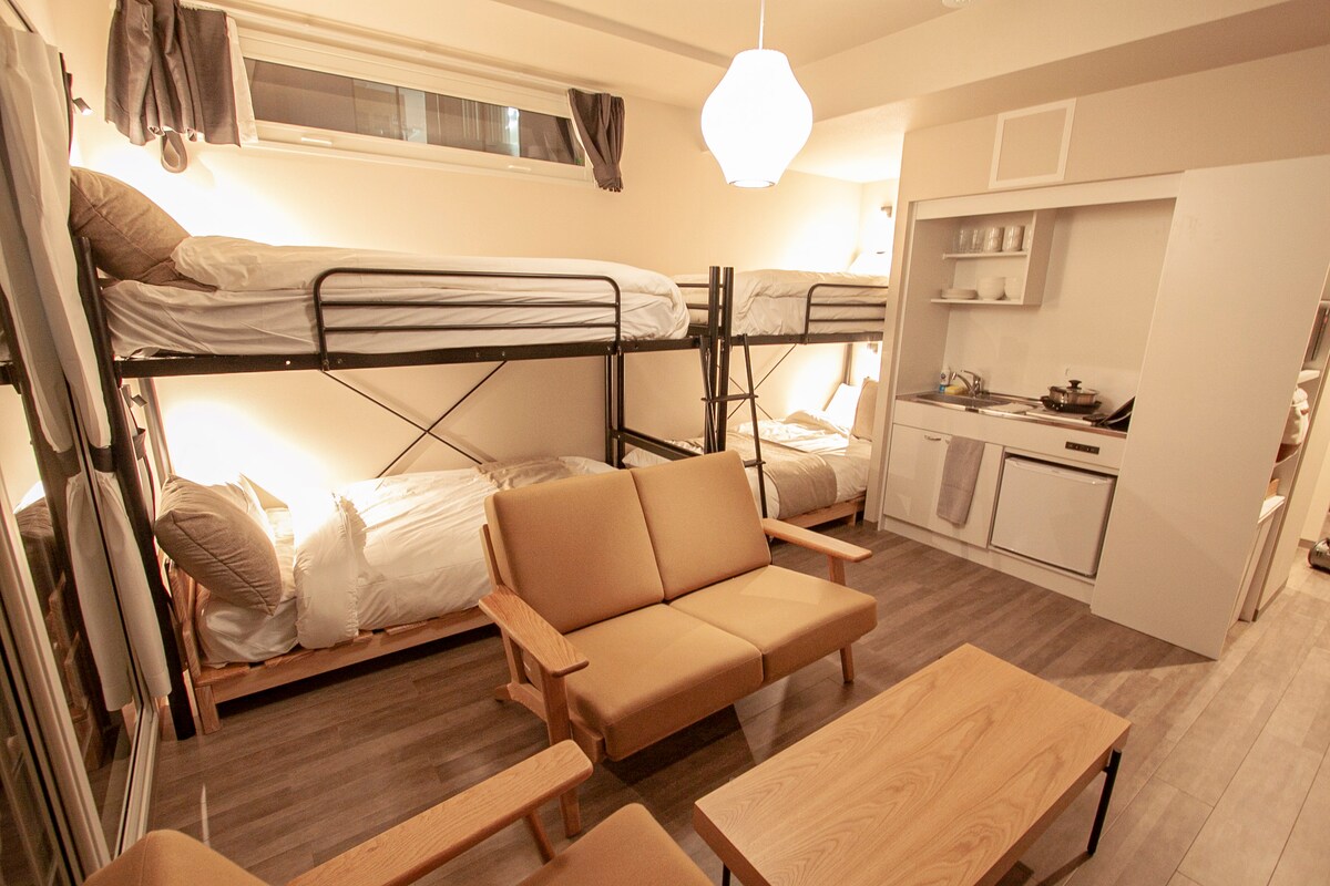 Very Accessible for 110m from nearest subway sta & tram sta. Also good access to Odori! I recommend you go to there by walk if it’s sunny. There are a lot of restaurants nearby, so you can enjoy sightseeing without any inconvenience. FREE FOR USE: WIFI, washing machine/w detergent, hairdryer and towels BEDS: Two bunk-beds for 4 people. ACCESS: 110m from Subway Price: Children under 2 years old are free.