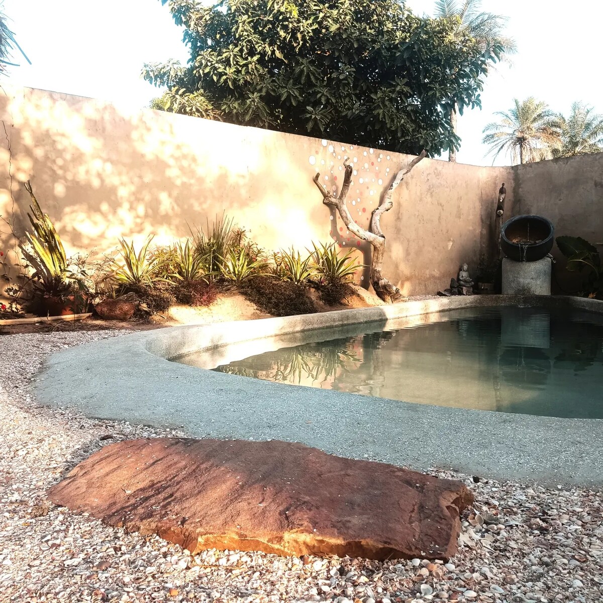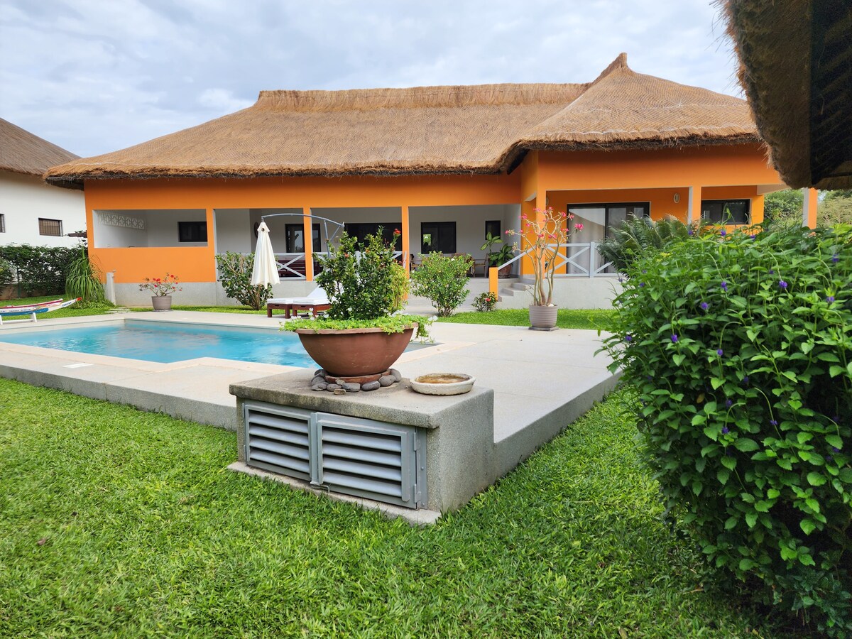 Comfortable and very calm villa with a spacious pool 300 yards away from the shoreline of Kabrousse/Cap Skirring sitting in the peaceful guarded community of La Palmeraie. You have the ocean, a resort pool, 24h guarded security, and a place to have breakfast buffet and lunch/dinner on the beach right next door. We only use quality linens for our 3 beds.