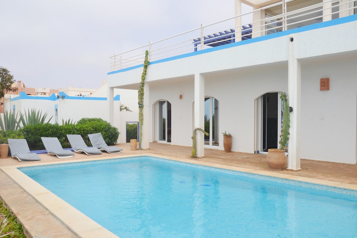 Magnifique villa vue sur mer avec piscine au style moderne avec une touche artisanale berbère. La Villa dispose de 3 chambres avec salles de bain individuelles. Les chambres peuvent accueillir de 1 à 3 personnes. La totalité de la maison est accessible et privatisée. une femme de ménage fournie pendant votre séjour