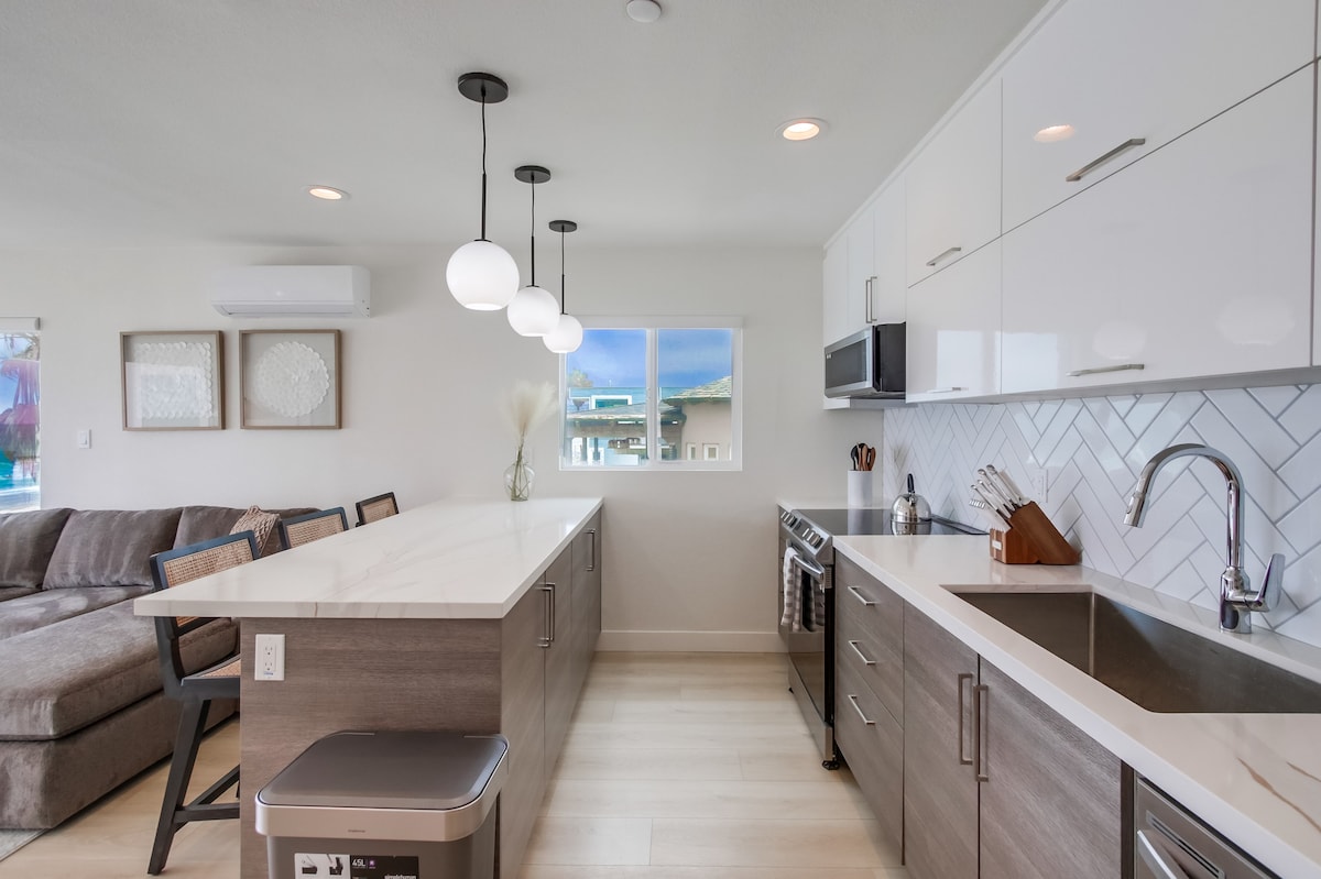 Renovated Modern BaySide Condo, 1 block from the Beach, Mission Bay, Belmont Park, restaurants, rentals, & beach activities Featuring 1 bedroom with a Queen size bed with a room AC, 1 bathroom, comfortable seating in the living area with fan, fully stocked kitchen with stainless steel appliances & everything else you would need to prepare a gourmet meal + Separate dining area with seating. Outdoor seating area with BBQ grill and a fire pit. Suitable for 2 adults only.