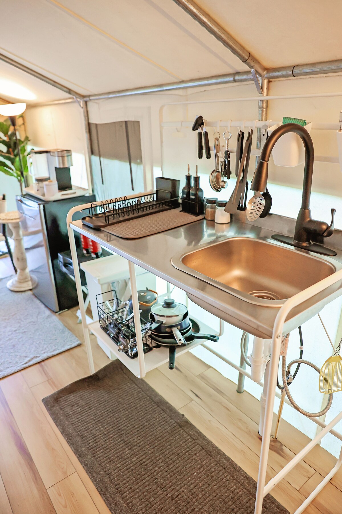 Çadırın içərisində 150-179 sm-lik çarpayı, kondisioner/istilik var. Qazanlar və tavaları olan düşərgə mətbəxi var. Friqin üstündə bütün düzəlişləri olan qəhvə qabı var, əsas yemək qabları olan vanna var. İki ocaqlı düşərgə sobası, propan verilir, kömür manqal,kömür təmin edilmir, yanğın çuxuru, satınalma üçün mövcuddur. İsti su qızdırıcısına və tualetə olan açıq havada duş var. Tualet kağızı, sabun və şampun təmin edilir. Duş və çay üçün dəsmallarınızı gətirin.