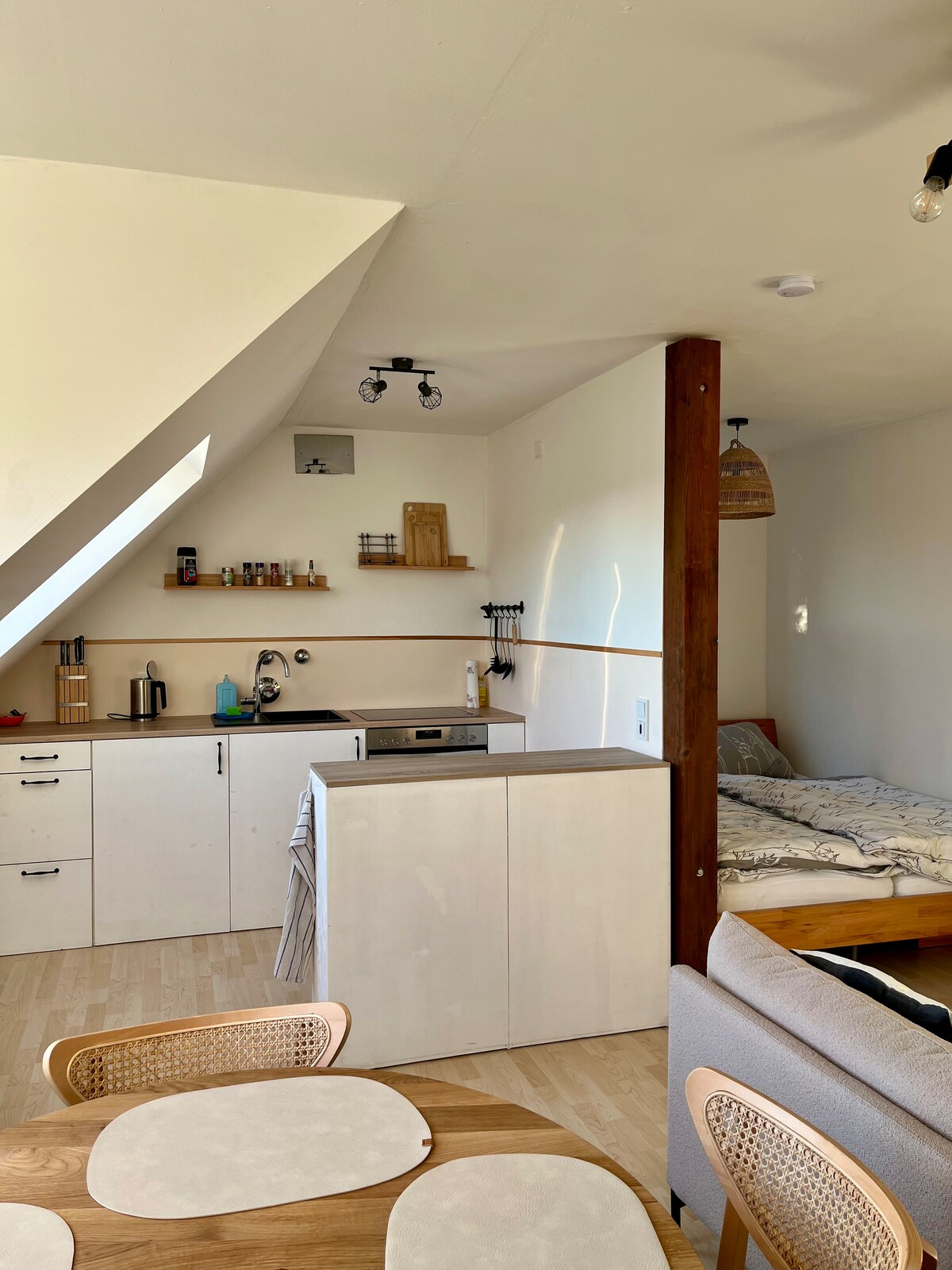 Wunderschöne 2,5-Zimmer-Dachgeschosswohnung in Bayreuth, nur wenige Gehminuten vom Festspielhaus entfernt. 2023 frisch saniert, erwartet Sie hier eine stilvolle und gut ausgestattete Wohnung mit hochwertigem Design. Der offene Wohnbereich und die modernen Annehmlichkeiten sorgen für höchsten Komfort. Ideal für Paare oder kleine Gruppen. Parken Sie direkt vor der Tür und genießen Sie die perfekte Lage für einen entspannten Aufenthalt in der Kulturstadt Bayreuth.