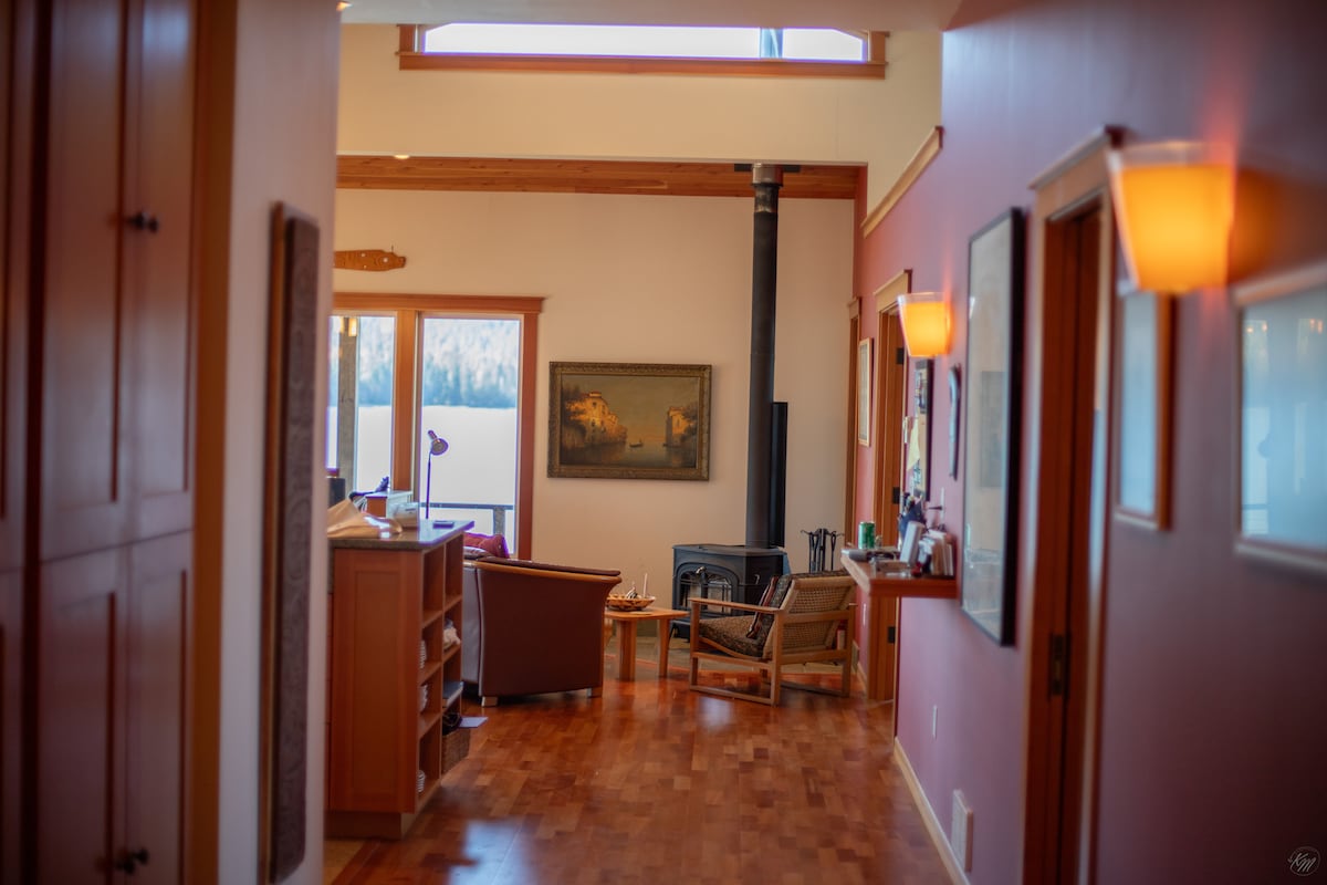 **2026-cı ilin may-iyun aylarında bazar ertəsindən cümə axşamına qədər damda işlər aparılacaq və gündüz vaxtı səs-küy/işçilər ola bilər. Həmin günləri bloklamışıq, lakin sorğu göndərilsə, onları aça bilərik.** Driftvud Sarayı yenicə təmir edilmiş 1 yataq otağı / 1 hamam otağı sahilyanı qonaq otağıdır. Peterburqun mərkəzindən qısa 5 dəqiqəlik məsafədə olsa da, demək olar ki, hər otaqdan su mənzərəsi olan bir dünya hiss edir. Qərbə baxan örtülü eyvan Wrangell Narrows-dan cəmi bir neçə addımlıq məsafədə yerləşir və gün batımını, vəhşi təbiəti və qayıqları seyr etmək üçün əla yerdir.