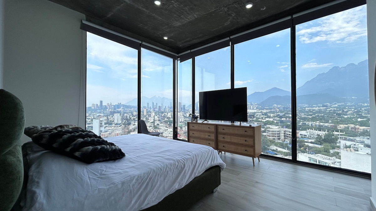 !Ən yaxşı Mövqe və Monterrey 360 görünüşü! Penthouse tamamilə lüks örtüklər və Alexa sistemi ilə yenidən qurulub. 65’’ və 50" c/Firestick (kanallar və tədbirlər) 2 ekran. Asan giriş imkanı olan və təhlükəsizliyi təmin edən ərazidə yerləşir. 2 mərtəbəli Penthaus: Aşağı hissə: Mətbəx, yemək otağı, divan çarpayısı olan sosial sahə; ayaqüstü masa; buxarı, dondurucu, hamam-tualet, TV və Terras (kreslolar) Üst hissə: Yataq otağı, çarpayı (150-179 sm), TV, minibar və masa Hovuz, İDMAN ZALI və Görüş Otağı