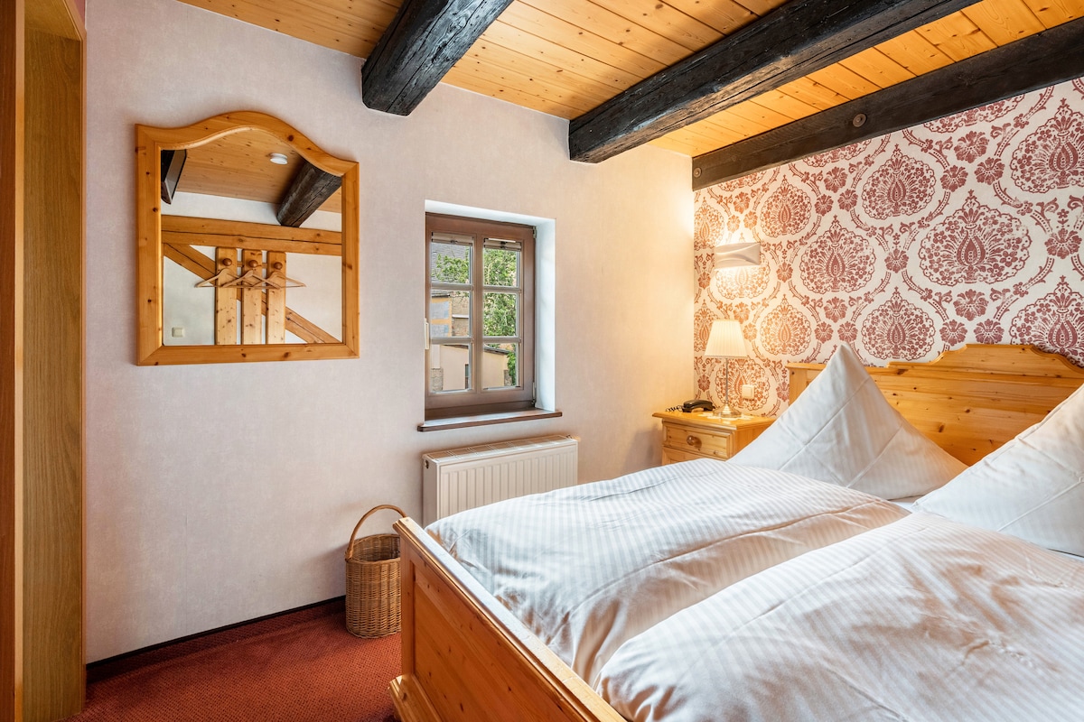 Our fairy tale room is a cozy two-bed room designed for a maximum of two people, it offers with its sloping walls a cozy ambience for extensive relaxation. With hand-painted beds and chests of drawers, it has been restored to its original state and offers a small modern bathroom as a contrast.