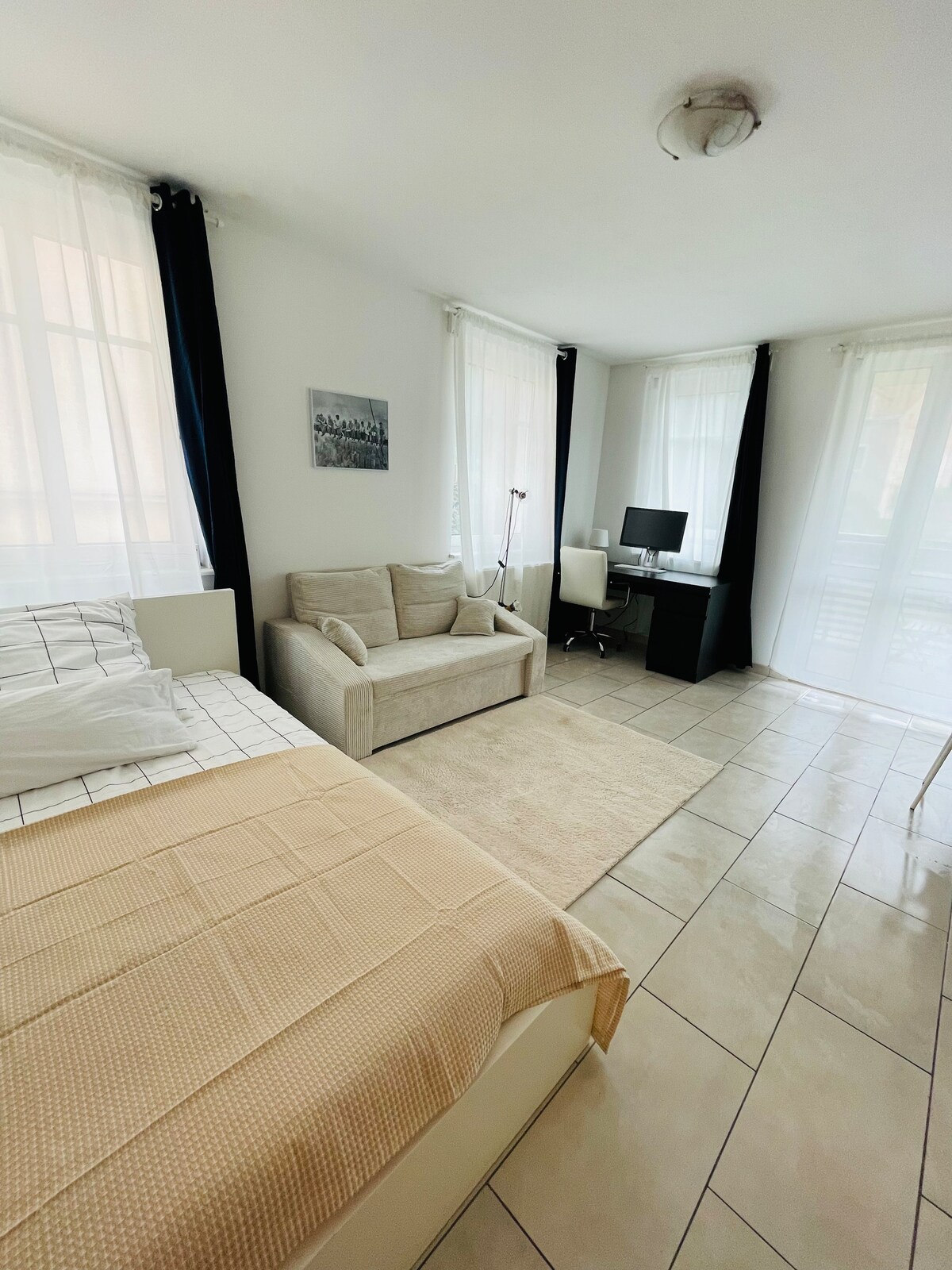 Çemnitsin mərkəzindəki rahat studiyamıza xoş gəlmisiniz! Mənzil üçüncü mərtəbədədir və geniş balkon da daxil olmaqla bütün lazımi avadanlıq və mebellərlə tam təchiz olunub. Böyük çarpayınız və açılan divanınız, böyük OLED televizorunuz, soba, qəhvə maşını və soyuducusu olan funksional mətbəxiniz, duş və paltaryuyan maşını olan müasir hamam otağınız var. Öz-özünə giriş mümkündür.