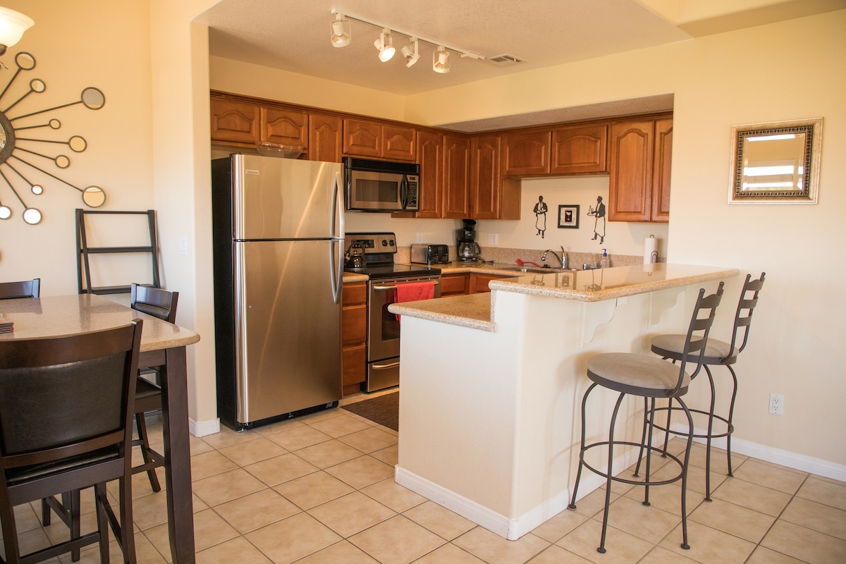 Bu kondominium Mesquitesin əfsanəvi qürublarının möhtəşəm səhra mənzərələrini təklif edir. 3 çarpayı və 2 vanna Volf Krik Qolf Klubunun bu müasir və yenilənmiş kondominiumunda rahat qonaqlamadan zövq alın. Bu ev sizin və dostlarınızın/ailənizin rahat həftəsonu tətili və ya uzun müddətli qonaqlaması üçün tam təchiz edilib və hazırdır. Kazinolar, restoranlar və məşhur qolf meydançalarından zövq alın - hamısı 5 dəq-dən az məsafədə! Sion Milli Parkından 1,5 saat Sent-Corcdan 40 dəq Ərazidə pulsuz avtomobil və qoşqulu parkinq mövcuddur.