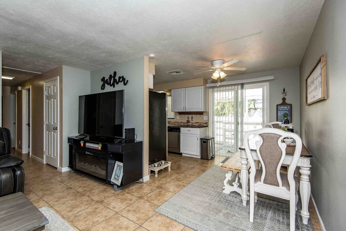 Welcome to The Bullhead Boho! A unique three bedroom home backed up to a tranquil green belt with lakes for fishing less than a quarter mile to the main highway or our private launch and beach. Nestled in Palo Verde Meadows, our home sleeps 8 completely comfortably with space for hanging out in the backyard, or playing shuffleboard or family dinner on the oversized vintage dining table. *Currently decorated for the holidays*