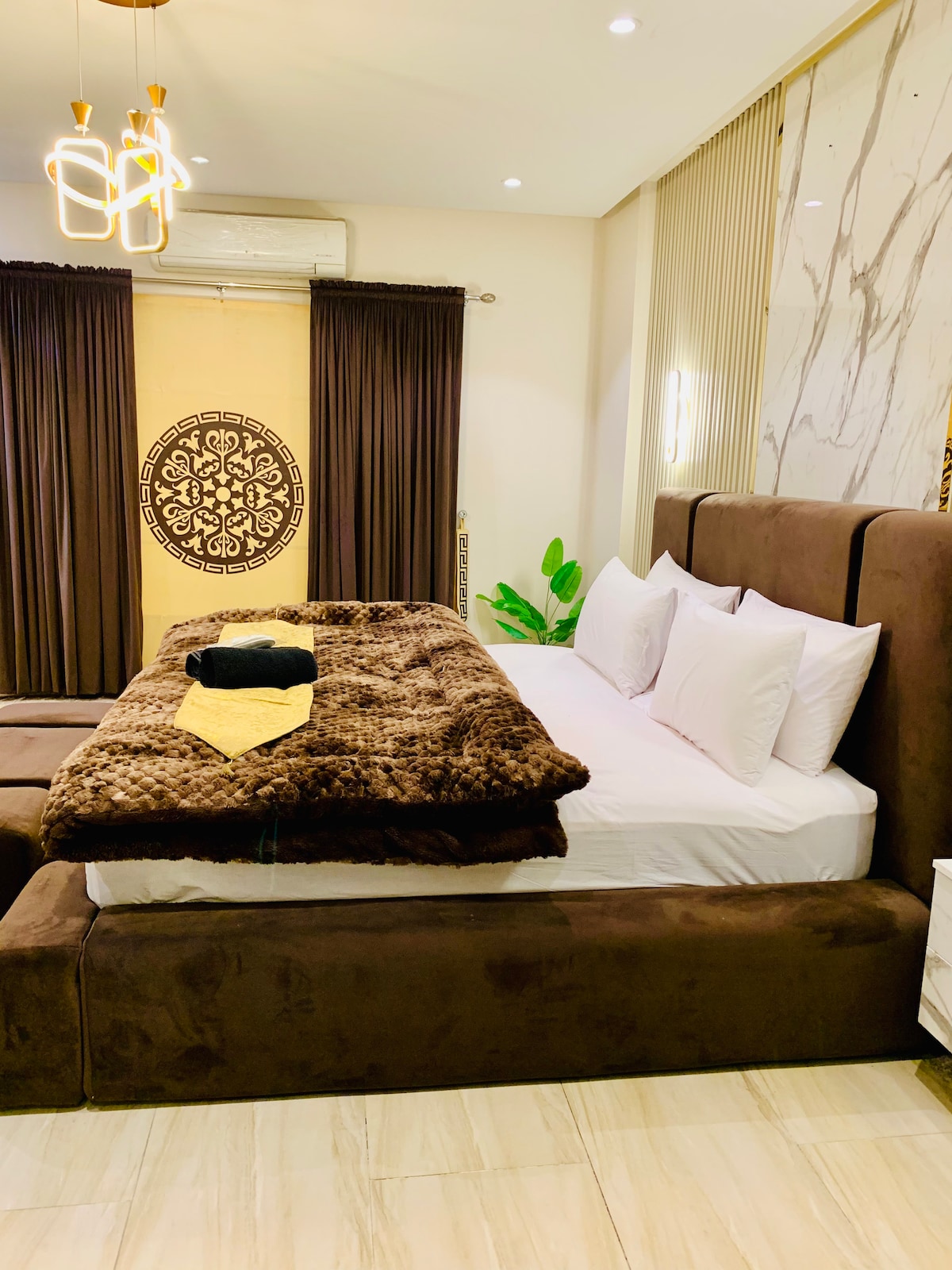 Welcome to your private & peaceful retreat at Sky Park One residences in the heart of Gulberg Islamabad — a sophisticated apartment blending elegance and comfort. Featuring two beautifully styled bedrooms along with a relaxing beautiful lounge, each with its own unique charm, the residence offers an exceptional stay. PLEASE KEEP IN MIND IT IS NOT A HOTEL, IT IS AN APARTMENT YOU ARE RENTING OUT SMOKING IS STRICTLY PROHIBITED INSIDE THE APARTMENT. DOING SO WILL RESULT IN A RS.25000 FINE.