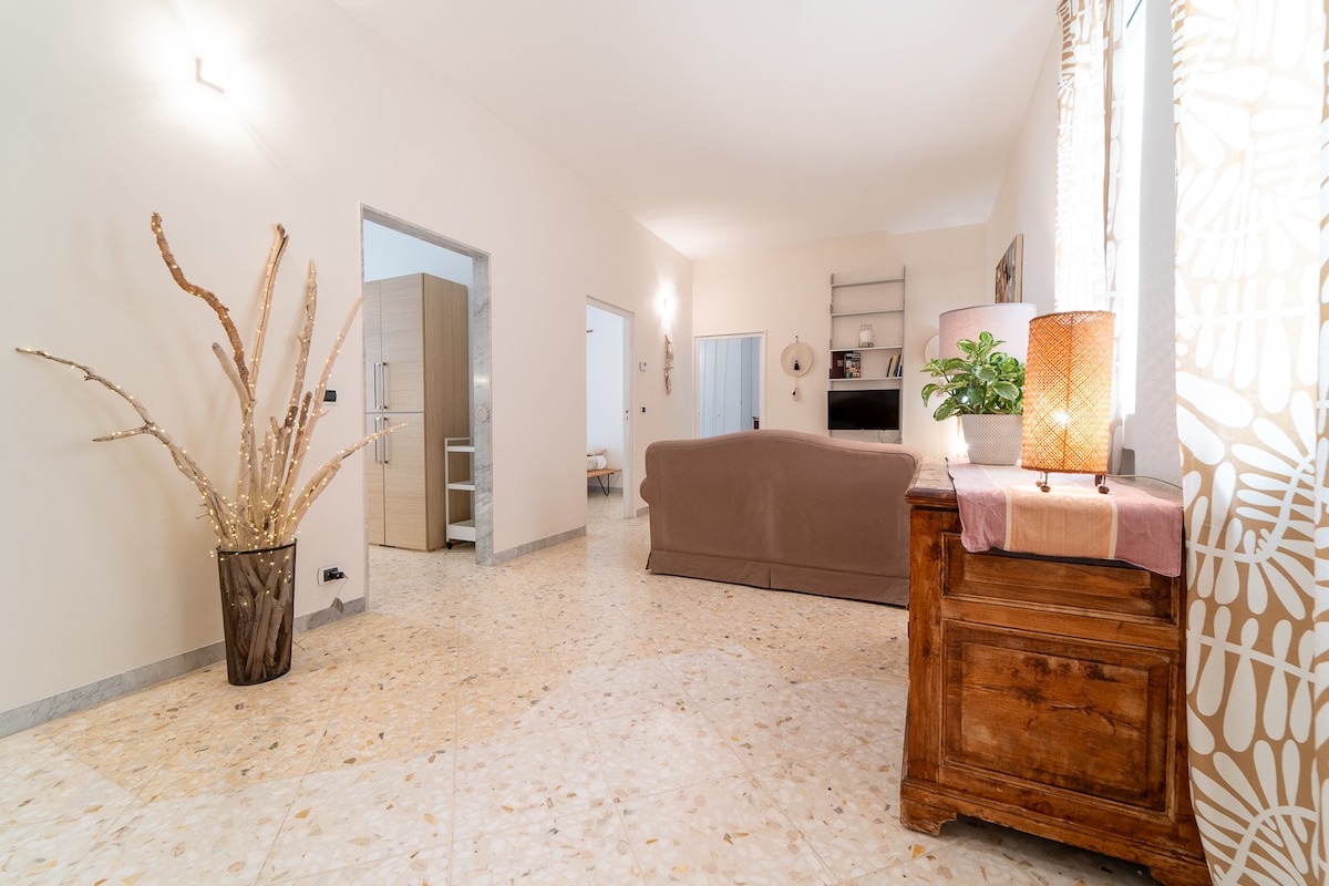 İki eyvanı olan, ailələr və ya qruplar üçün ideal olan 106 kvadratmetrlik mənzil. - Balkonlu ikimərtəbəli yataq otağı - 2 birnəfərlik çarpayısı olan və balkonu balaca mətbəxlə birləşdirən otaq - Divan çarpayısı, ağıllı televizor, kitab şkafı, Wi-Fi olan geniş və işıqlı qonaq otağı - Geniş duşu olan yeni hamam otağı Müasir toxunuşlarla vintaj dekorasiya. Mərkəzdə yerləşən ev, bütün imkanlara və yaxınlıqda pulsuz parkinqə yaxındır. Domeniko Moduqnonun vətənindən bir neçə addım.