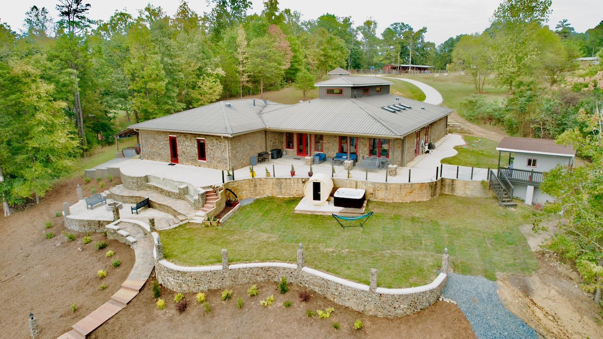 Vacation getaway on 20 acres. 1100 sqft wrap around covered porch overlooking a 3/4 acre private pond. The pond is well stocked with bass and brim for easy catching. Large fire pit with log benches between the house and pond. Great sound system! Guests are able to connect their device to the sound system and enjoy their music inside and out. The pond includes a paddle boat and there are life jackets in the barn. Downstairs has a fridge, pool table, dart board, & other games for our guests.