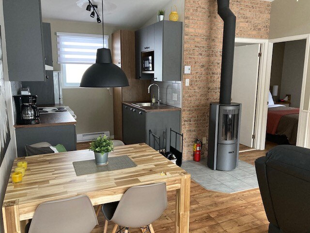 CITQ # 303514 Cənnətə xoş gəlmisiniz! Xizək stansiyasının alp kəndində: Mont-Édouard Birinci mərtəbə 7 veranda qapısı, tam vanna otağı (şüşə duş), camaşırxana otağı və vestibüllə əhatə olunmuş açıq plandadır. Şifrə döşəməsi qızdırılır. Qonaq otağında taxta buxarı və 60 düymlük televizor ekranı. Paltaryuyan və qurudan maşın, uzaqdan iş üçün WiFi, açıq buxarı, gəlişə daxil olan ağac, barbekü (yalnız yayda). Məxfilik təmin edir.