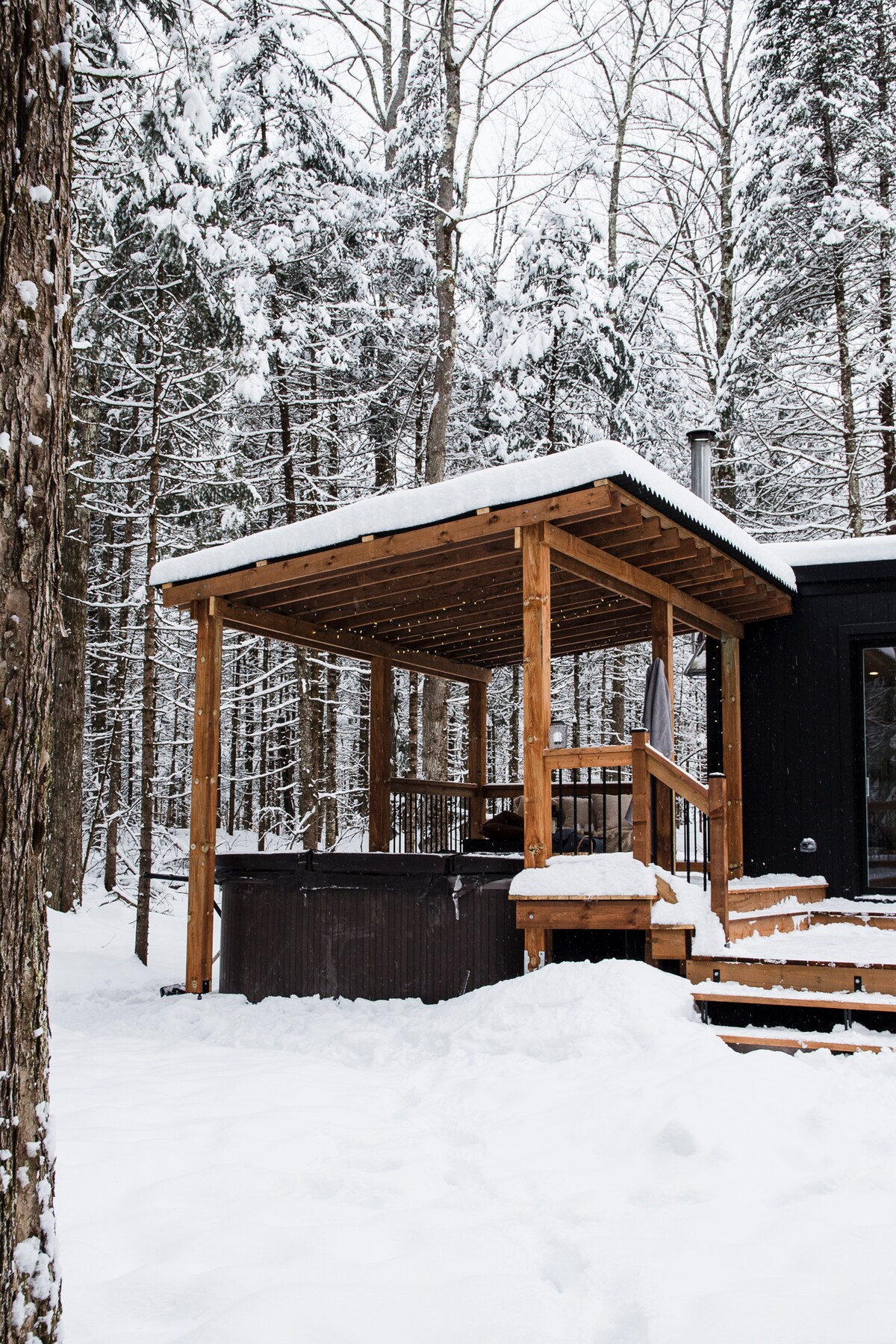 Un séjour de rêve en nature! Notre Cabin dans les bois est à l'extrémité du domaine et offre une plus grande intimité aux invités. Le son du ruisseau qui perle juste à l'arrière de la Cabin, en plus du mouvement des feuilles dans les arbres, nous rappelle les bienfaits d'un séjour en nature! La Cabin est perchée sur pilotis et offre une vue panoramique incroyable! Vous serez au paradis dans notre spa ainsi qu'au chaud près du foyer au bois ou plutôt au frais avec notre air climatisée!