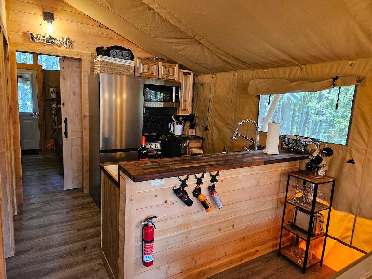 Göl və meşə mənzərəli böyük göyərtəsi olan qaldırılmış platformada 16x20 divar çadırı Dağ Ağacı Çadırımıza xoş gəlmisiniz. Soyuq dalğıc və açıq havada (isti!) duş ilə tamamlanmış sidr saunasında dincəlin. Təzə dağ buzlu bulaq suyu. 2025-ci ildə yeni xarici evi brendləşdirin! Soyuq axşamlar üçün çadırın içərisində odun sobası. Möhtəşəm Düzbucaqlı Göl mənzərəsi üçün dağın zirvəsinə qədər yürüyüş edin. Ulduzlu gecələr və vəhşi təbiət qalereyası. Nəzərə alın ki, iki çadıra ehtiyacınız varsa, eyni əmlakda əlavə elanım var⛺️🏕