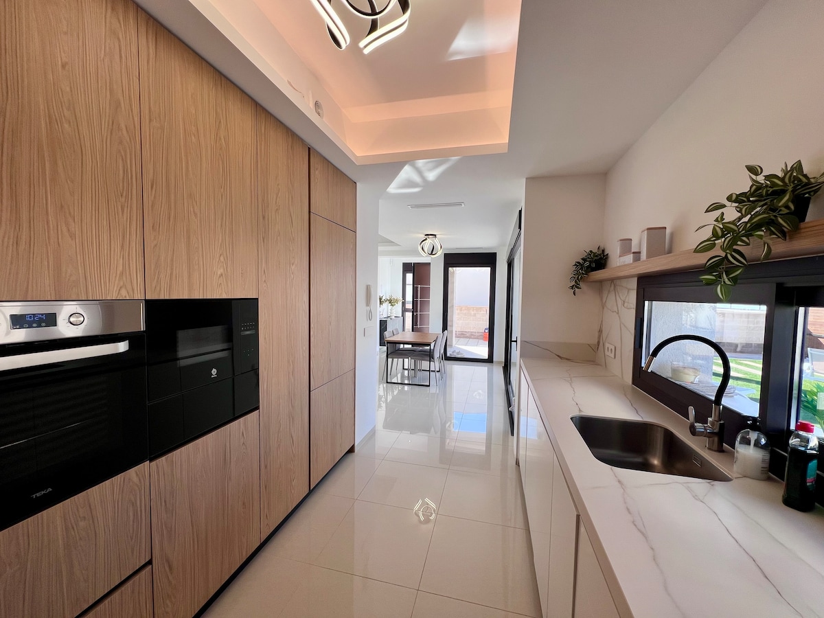 Qolf, çimərlik, barlar, restoranlar, böyük şəhər və ya sakit istirahət. Ailənizi və ya dostlarınızı gətirin və bu zərif qonaqlama yerindən zövq alın. Tam yeni lüks villada bir sıra imkanlar var. Açıq havada dincəlmək üçün mükəmməl müxtəlif oturma yerləri, günəş çarpayıları və barbekü olan ayrıca bağ və hovuz sahəsi. Şəhərin mənzərəsini seyr edə biləcəyiniz və dənizə doğru böyük dam terrası olan üç mərtəbədən çox donub qala bilərsiniz. Kondisioner və sürətli internet. 3 nəfərlik çarpayı 160*200 və 4 birnəfərlik çarpayı 90*200 təklif edirik.