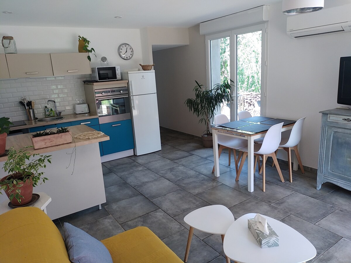 Logement lumineux et confortable de 65 m2 situé en rez de jardin de notre villa , au calme . Grande pièce de vie avec salon , salle à manger et cuisine ouverte entièrement équipée. Deux chambres avec literie de qualité , salle de bain moderne avec douche à l’italienne et espace laverie. Terrasse agréable pour se détendre. Draps et serviettes fournis . Animaux acceptés sous conditions. Emplacement idéal entre mer et montagne.