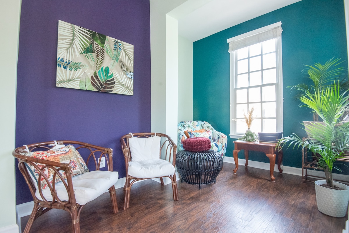 Sonos Surround Sound dinamik sistemi ilə lüks 4 mərtəbəli şəhər evi. Ayrıca dam örtüyü olan Charlottes göy xəttindən və stadion mənzərələrindən zövq alın. Müasir dekorasiya Şarlottada əyləncəli dolu bir gündən sonra oturub dincəlmək üçün lazım olan məkan və komfort təmin edir. Mərkəzdə yerləşir. Optimist Hall, Noda və Plaza Midwood-a 8-10 dəq. 3 BR, 4.5 vanna, Master-də Peloton. Qaraj-EV Şarj cihazı və Tork universal idman zalı. Etibar Sahəsinə, Bank of America Stadionuna və daha çoxuna gedə bilərsiniz! TESLA icarəmiz və işə götürmək üçün AYRICA AŞPAZIMIZ haqqında soruşun!!