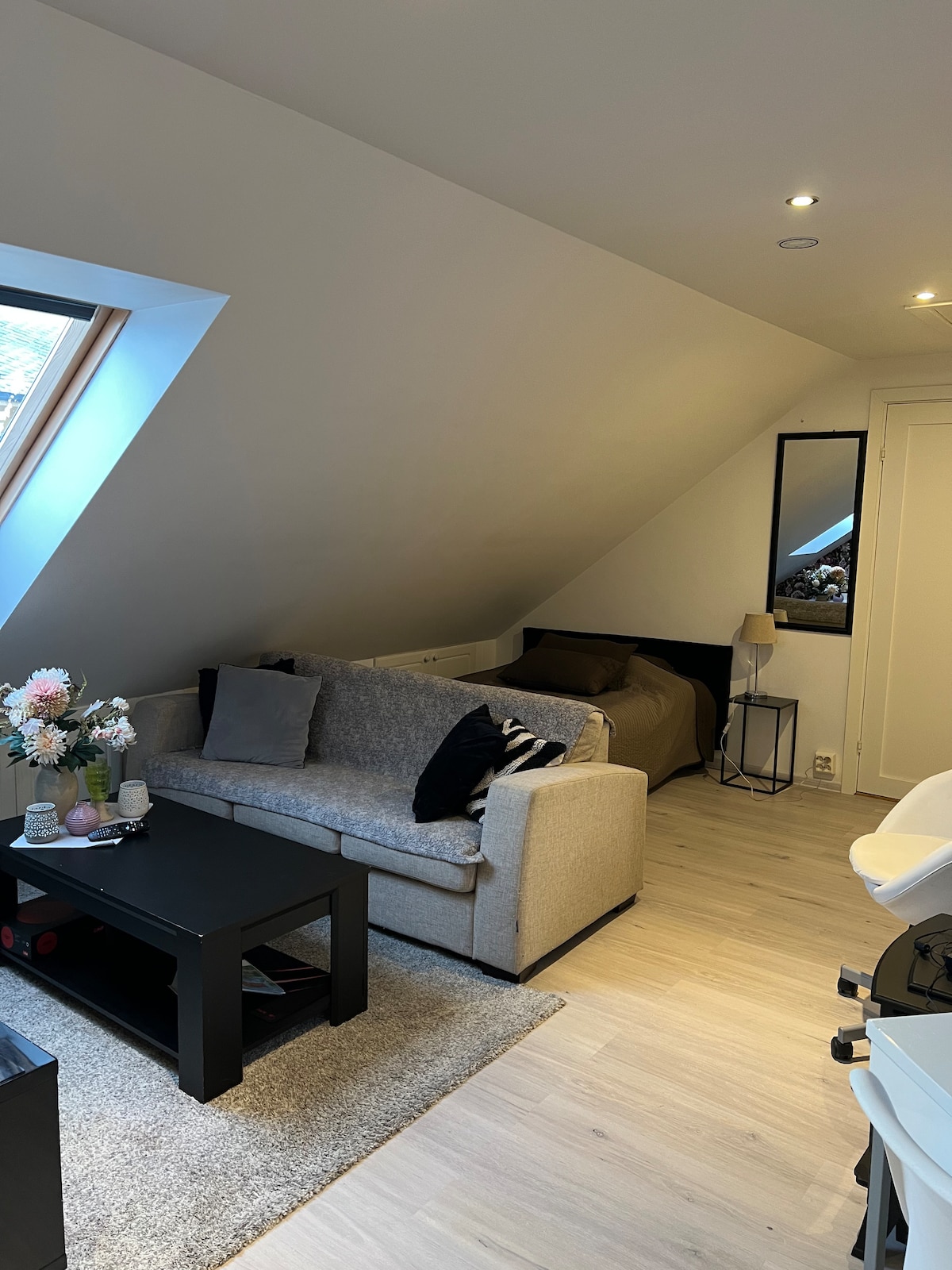 İkinəfərlik yataq otağı və qeyri-məcburi qonaq çarpayısı olan rahat loft mənzil. Divan və televizoru olan işıqlı qonaq otağı. Duş və tualeti olan ayrıca hamam otağı. Açıq havada oturma sahəsi. Nəzərə alın: Mətbəx və ya yemək bişirmə imkanları mövcud deyil. Su qızdırıcısı və pulsuz qəhvə. Soyuducu. Pulsuz parkinq və Wi-Fi. Ərzaq məhsullarına 1 dəq, ticarət mərkəzinə 7 dəq, Kristiansund mərkəzinə 15 dəq, Atlantik Yoluna 40 dəq məsafədə rahat yerləşir. Paltaryuyan maşın və quruducu icarəyə verilir.