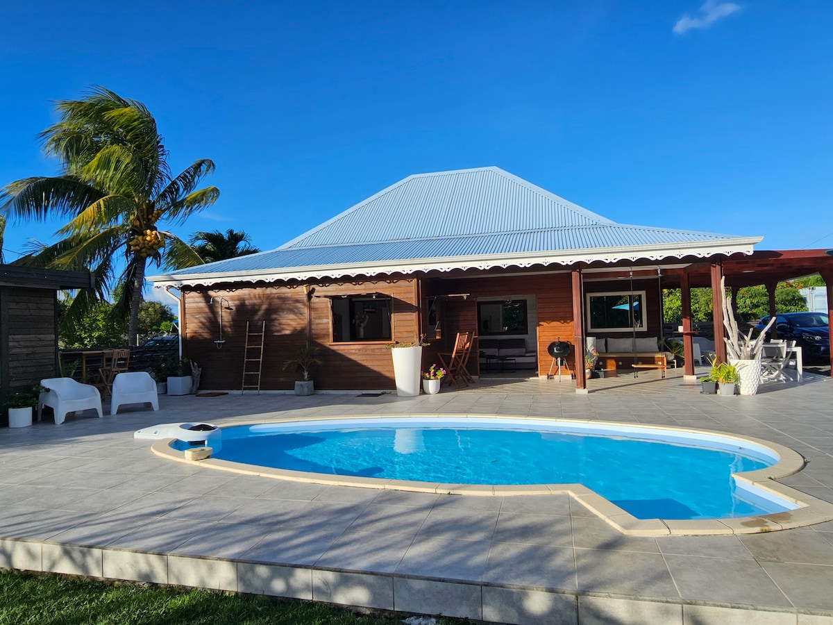 Maison bois de 50 m2 avec terrasse, 4 personnes maximum, piscine de détente privée avec buses spa dans un quartier résidentiel paisible situé à la campagne. À 5 mn du musée Edgar Clerc, 8 mn du centre commercial Baie Side, 15 mn de la Plage de l'Autre Bord & 20 mn de la Porte d'Enfer. Détendez-vous dans ce logement calme et élégant vous y serez les bienvenus. Logement non-fumeur. Les fêtes sont interdites. Pas de décoration pour les anniversaires. Piscine non chauffée. ARRIVÉE A PARTIR DE 15H00.