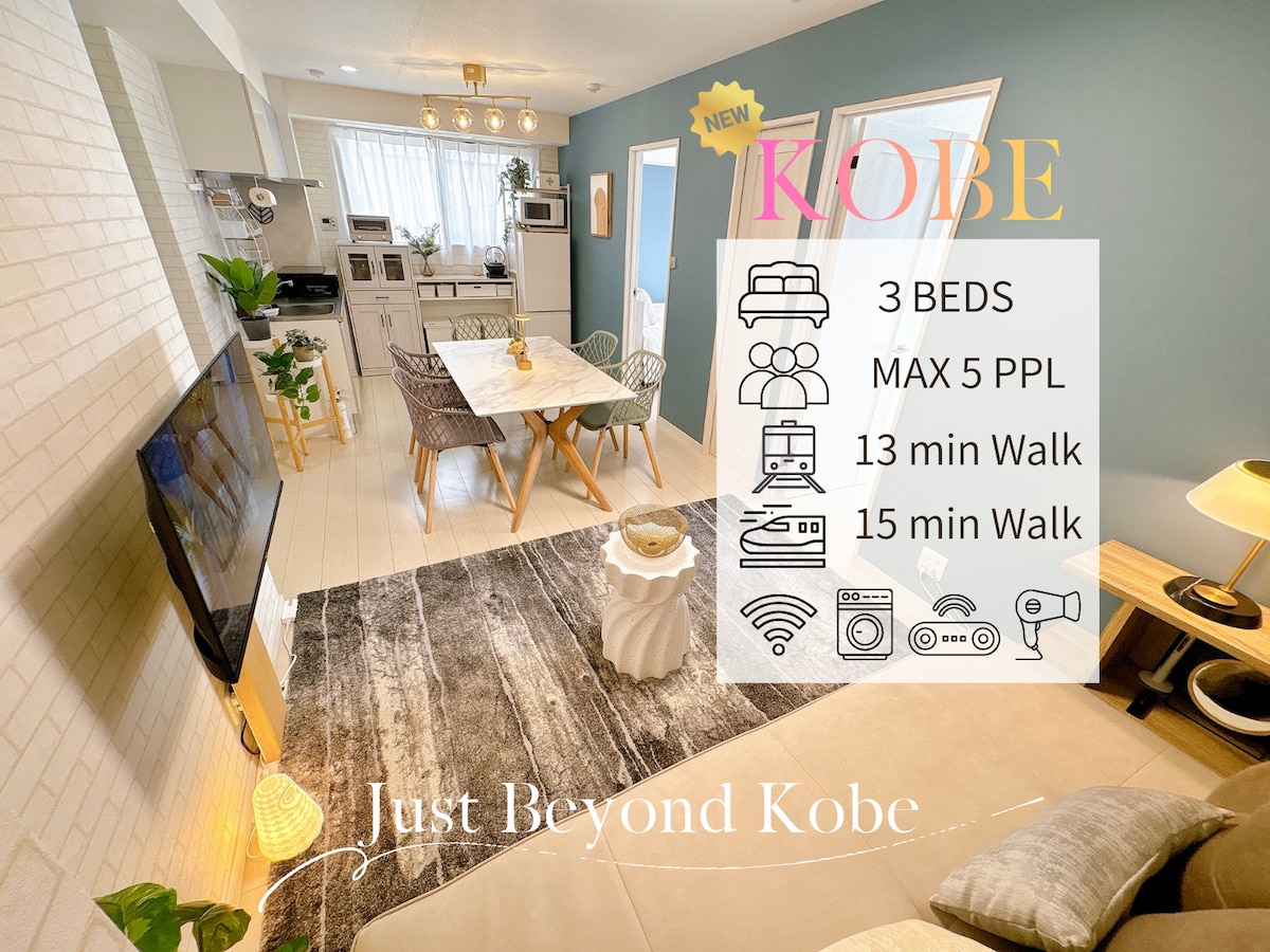 A relaxing base for families traveling across Japan. 15-min walk to Shin-Kobe Station (Shinkansen). Osaka ~30 min, Kyoto ~45 min, Tokyo ~3 hrs. Walkable to central Sannomiya, yet quiet for nights. 2-year-old building; all furniture & appliances are brand new and kept clean. Local market 3 min away—cook meals that fit your family. Dine together in the living room; separate bedrooms let everyone sleep at their own pace. Return each night and unwind without moving luggage.