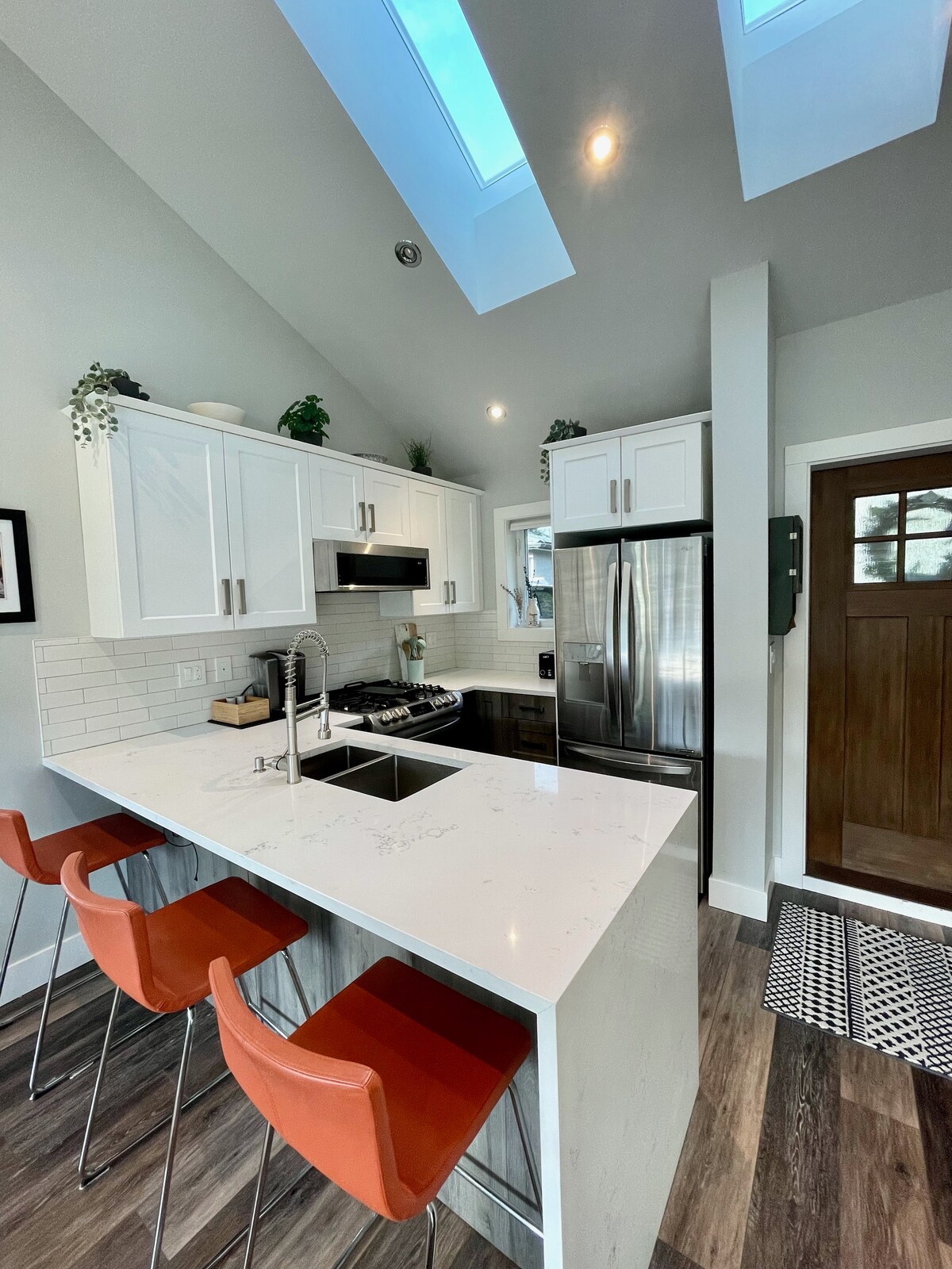 Our lovely, new bright, modern, house sleeps up to 4 guests. It's situated centrally in Vancouver, close to SkyTrain and just 2 blocks from trendy Main Street which has tons of great eateries and shops, and to the west a Community Centre! It's a 600 ft2 retreat in a quiet neighbourhood, perfect for professional adults and families alike. The open concept living/dining room has high ceilings, a Smart TV, free Wifi, Netflix, and an expandable dining table with banquet seating.