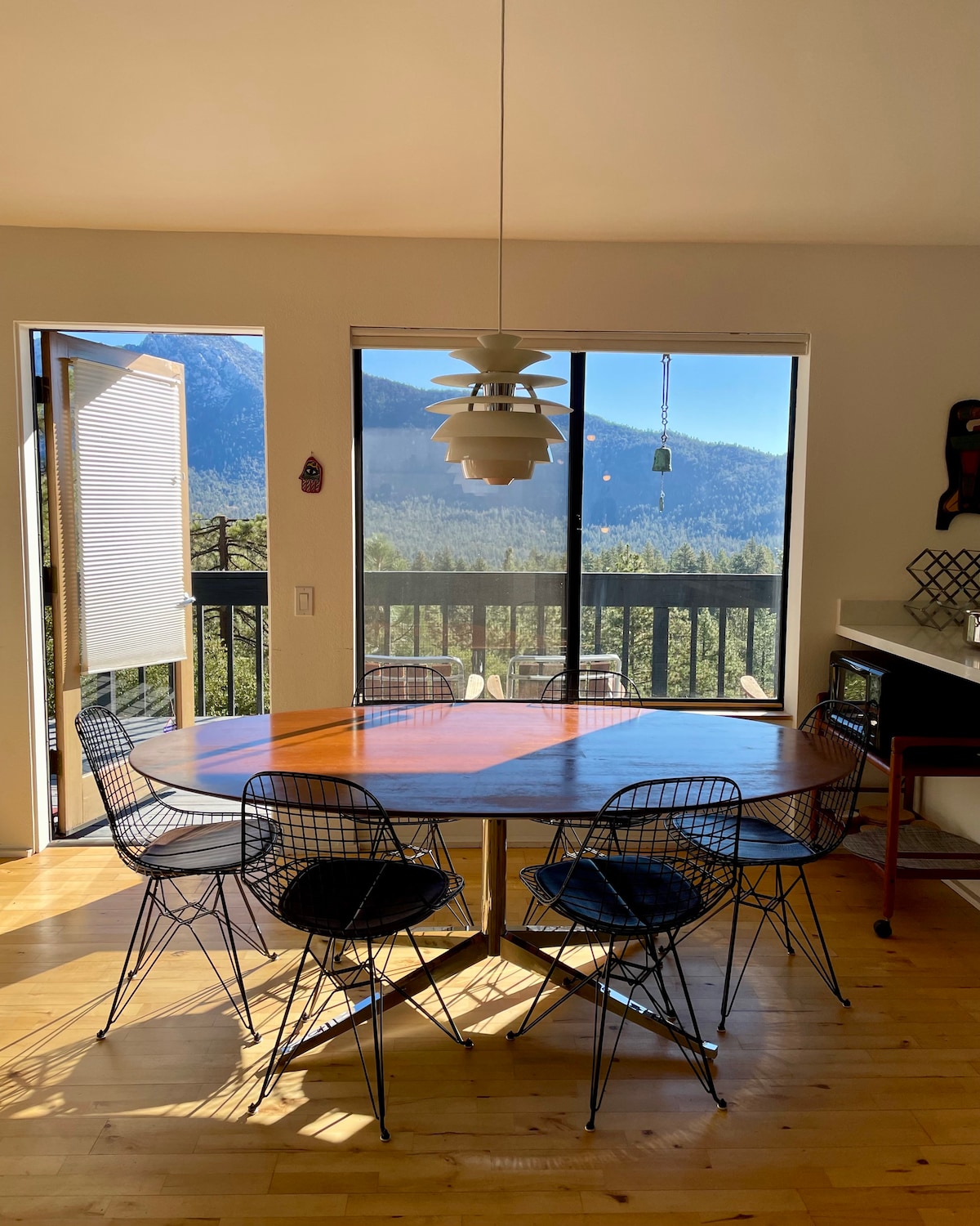 Perched high on Idyllwild’s North Ridge, Treetop Terrace sits in a canopy of oak trees and offers amazing views from its expansive upper deck. Enjoy the charm of its mid-century architecture and vintage-inspired furnishings. Features include floor-to-ceiling windows, an open-concept layout, a recreation room, and wheelchair accessibility. Conveniently located 3-minutes from the village, it is easy to enjoy the charms of Idyllwild and the beautiful San Jacinto mountains from the Treetop Terrace.