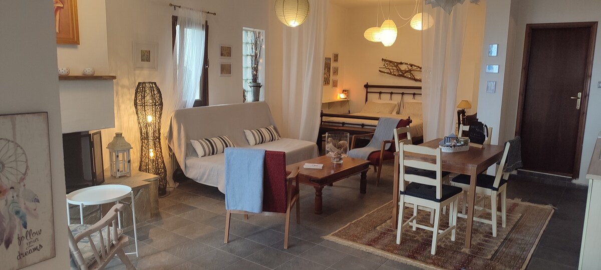 Studiya Pelion yaşıl dağında, unikal və mənzərəli Damoucharidə yerləşir. Yerləşdiyi yer dağ və dənizi birləşdirən təbiət bayramları üçün idealdır. İstirahət tətilləri üçün, eyni zamanda təbii gözəlliyi ilə seçilən yaxınlıqdakı kəndlərə və çimərliklərə sonsuz ekskursiyalar üçün idealdır. Burada ikinəfərlik çarpayı və divan çarpayısı var və qonaqlamanız zamanı ehtiyacınız olan hər şeylə müvafiq qaydada təchiz edilib.