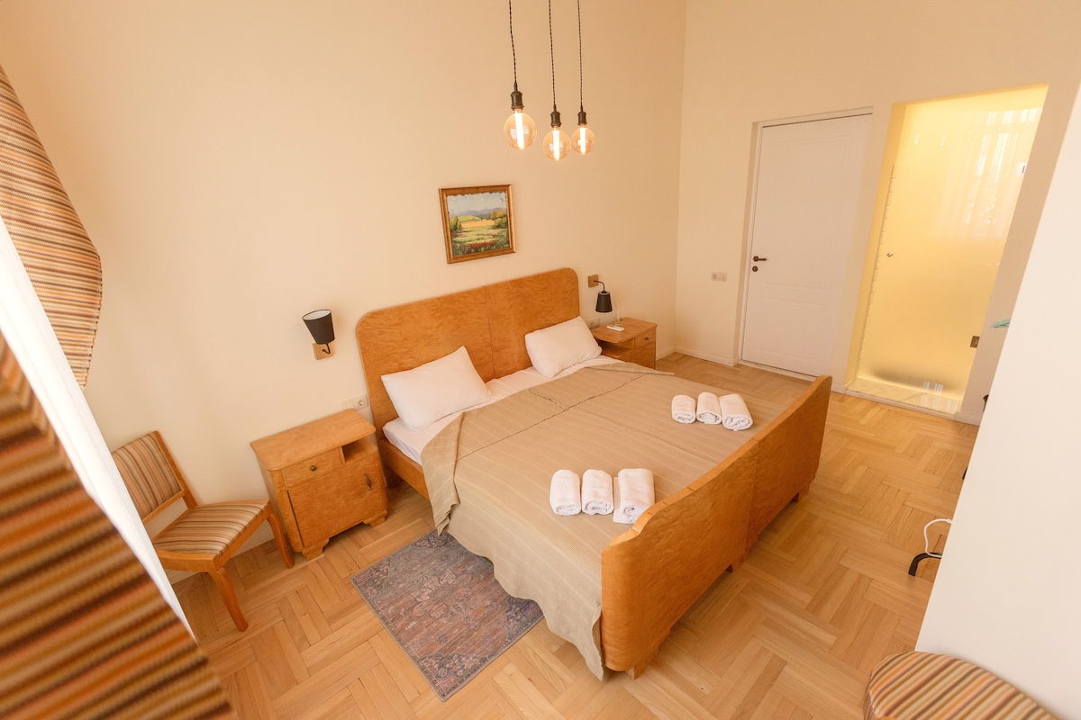 A spacious room in a young and developing Moosica Hostel in the very centre of Tbilisi. The hostel is located right between State Conservatoire and Tbilisi Opera and Ballet Theatre and has music as its main theme. This room has a king-size double bed, a table with 2 chairs, a clothes rack and a fan. Hostel guests can use a shared kitchen and bathrooms and spend time in a lobby with piano and bar.