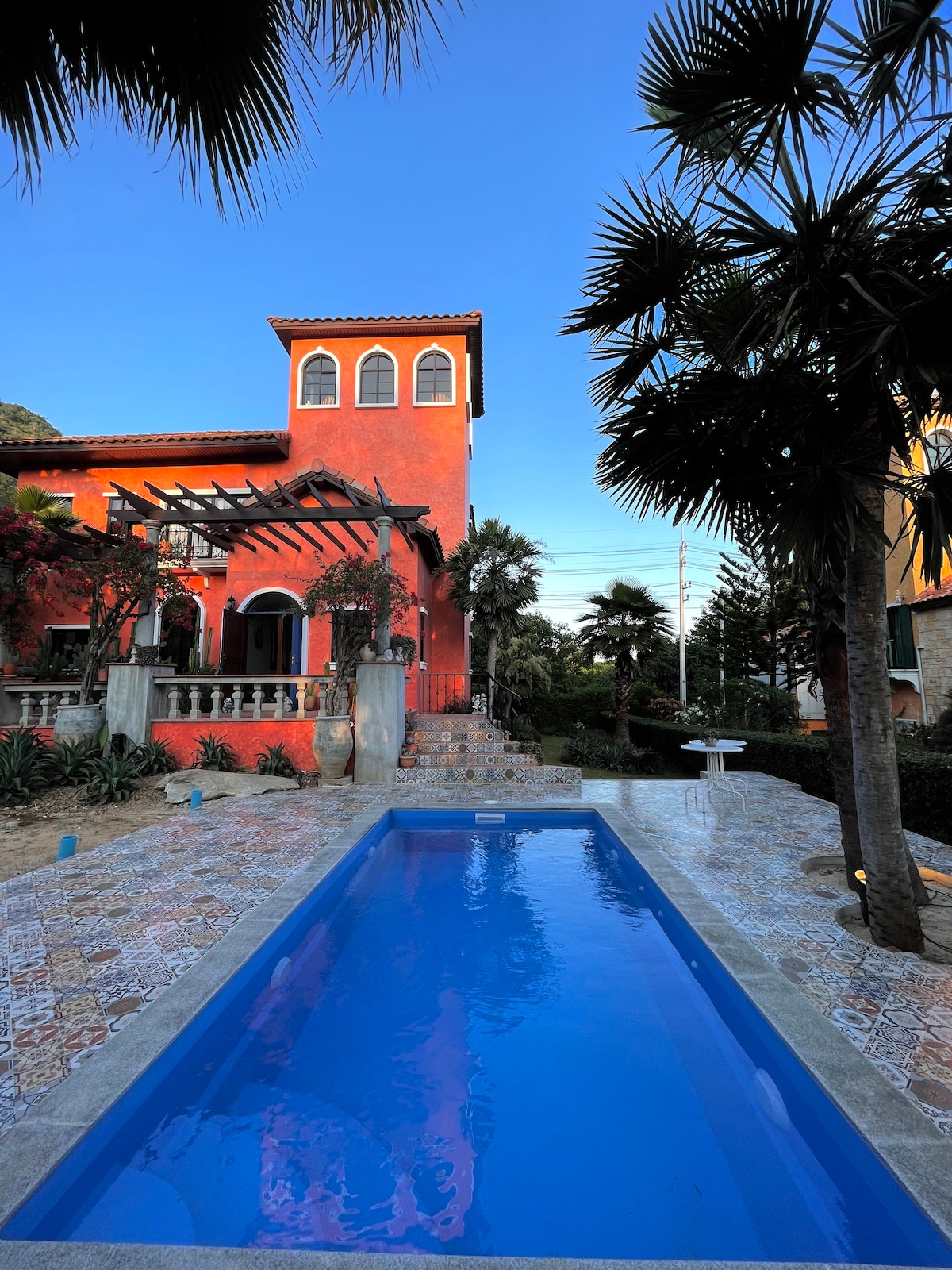 Escape to a peaceful villa surrounded by greenery and mountain views — a quiet retreat where you can relax, breathe, and enjoy nature. ✨ What you’ll get: • 🛏️ 5 bedrooms: • Bedroom 1: twin beds • Bedrooms 2–4: king bed each • Bedrooms 5: RV • 🛋️ Spacious living room with a sofa bed & 🎤 karaoke • 🏊 Swimming pool • 🔥 Sauna & ❄️ cold plunge • 🌳 Backyard with mountain views • 🌌 Giant balcony • 🍳 Outdoor kitchen • ⛳ Mini golf course • 🎱 Pool Table • 🔥 Fire pit & cozy outdoor area