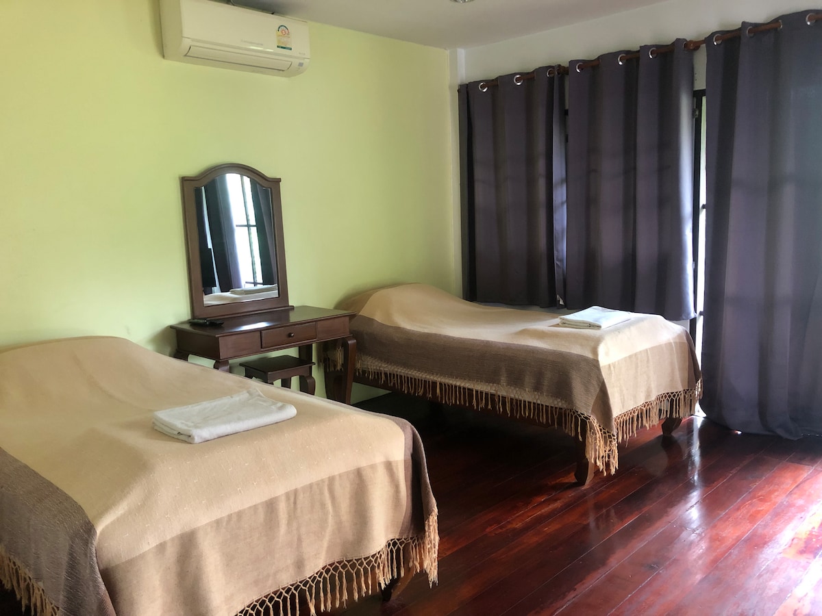 Hər pəncərədən təbiət mənzərələri açılan, yamyaşıl dağlarla əhatə olunmuş, bütün evdən ibarət rahat istirahət 🌿 İstirahət üçün mükəmməl olan sakit, rahat mühitdə il boyu təmiz havanın dadını çıxarın. 🚗 Banqkokdan cəmi 3 saatlıq məsafədə 📍 Moo Si-də, Khao Yai turistik yerlərinin yaxınlığında yerləşir 🏡 Dağ mənzərəsi | Məxfi və sakit 🛋 Kondisioner, televizor, soyuducu, tam təchiz olunmuş mətbəx, barbekü, açıq havada yemək masası, mikrodalğalı soba, çaydan, isti duş, divan, dinamik, saç quruducu, velosipedlər.