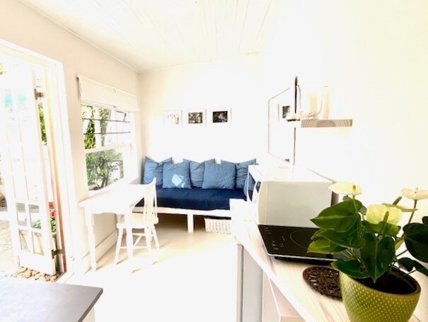 Bu kiçik studiya mənzili Muizenberqin aşağı dağ yamaclarında gözəl bir bağ mühitində yerləşir. Yataq otağı, hamam otağı, qonaq otağı, birnəfərlik davranış sobası və digər vacib imkanları olan kiçik mətbəx var. Muizenberq sörfinq çimərliyi 10-15 dəqiqəlik məsafədədir. Yerli mağazalar, restoranlar və kafelər kimi gözəl sahil və dağ gəzintiləri asanlıqla əldə edilə bilər. Məşhur Bluebird məhəllə bazarı cümə günü yerli istehsal olan yemək, pivə və şərabları dadmaq üçün əla yerdir.