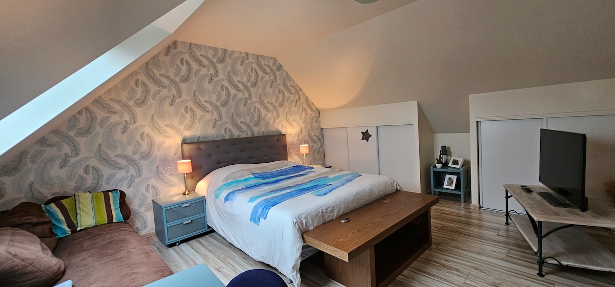 Our house is spacious and bright in a quiet area. We are from Sarthe and passionate about travel, meetings and exchanges. The house is decorated with souvenirs from our travels. Warm welcome in a family atmosphere. Your personal space has all the necessary equipment to make your stay as pleasant as possible. The Safari room is equipped with two 90x190cm beds, a desk, tea and coffee making facilities, and a lounge area. Your room offers you all the conditions for a good night's sleep (clean