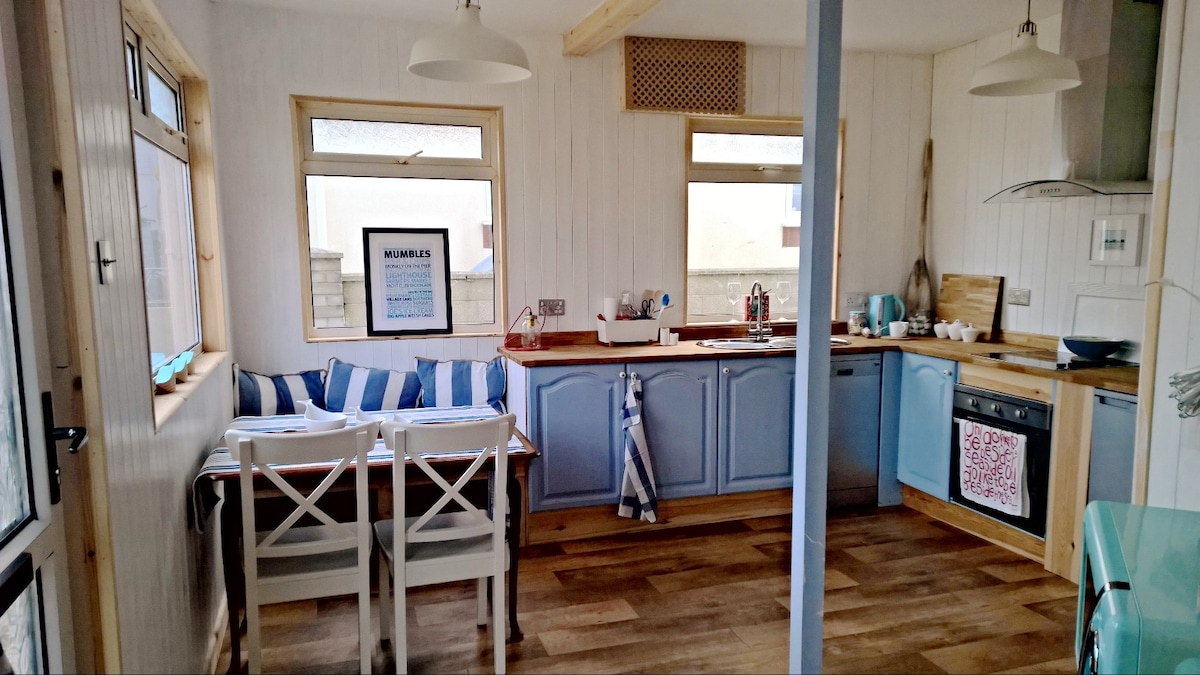 Your private suite is just 15 metres from the sea in our seafront home, with uninterrupted views across Swansea Bay. Step onto the new promenade or use the slipway opposite for swimming or paddleboarding. The space includes a king-size bed, large corner sofa (also a sofa bed), dining/work space, full-size fridge, and a modern shower room/WC. While there are no cooking facilities, the suite is equipped with cutlery, plates, bowls, and glasses, along with tea, coffee, and milk.