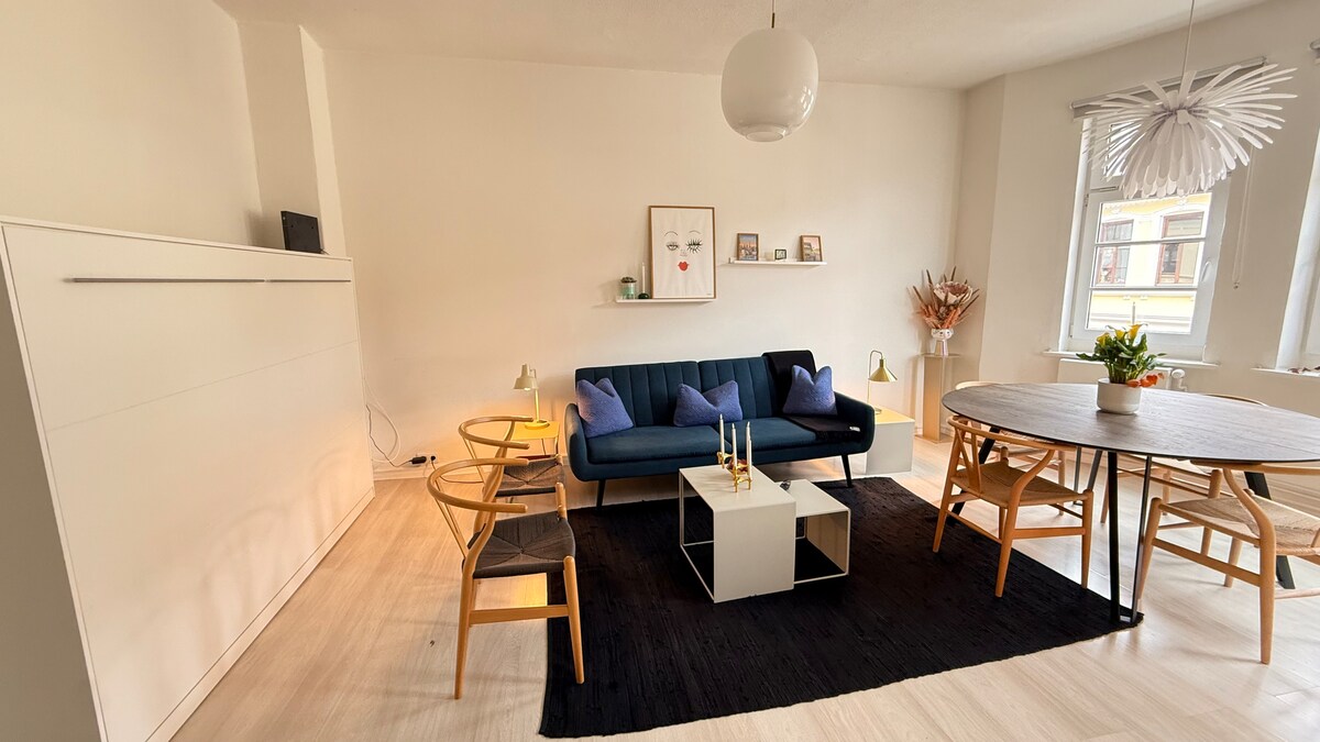 Cozy 50 m² apartment in the heart of Gråsten with charming views of the castle lake and Gråsten Castle. Nearby are shops, restaurants, the harbor, sandy beach, and forest for walks. The apartment offers an open kitchen/dining area for 4, living room with TV, bedroom with double bed and sofa bed, bathroom with shower bench, private terrace, access to a larger common terrace with lake and castle views, laundry (washer/dryer for a fee), and free on-site parking.