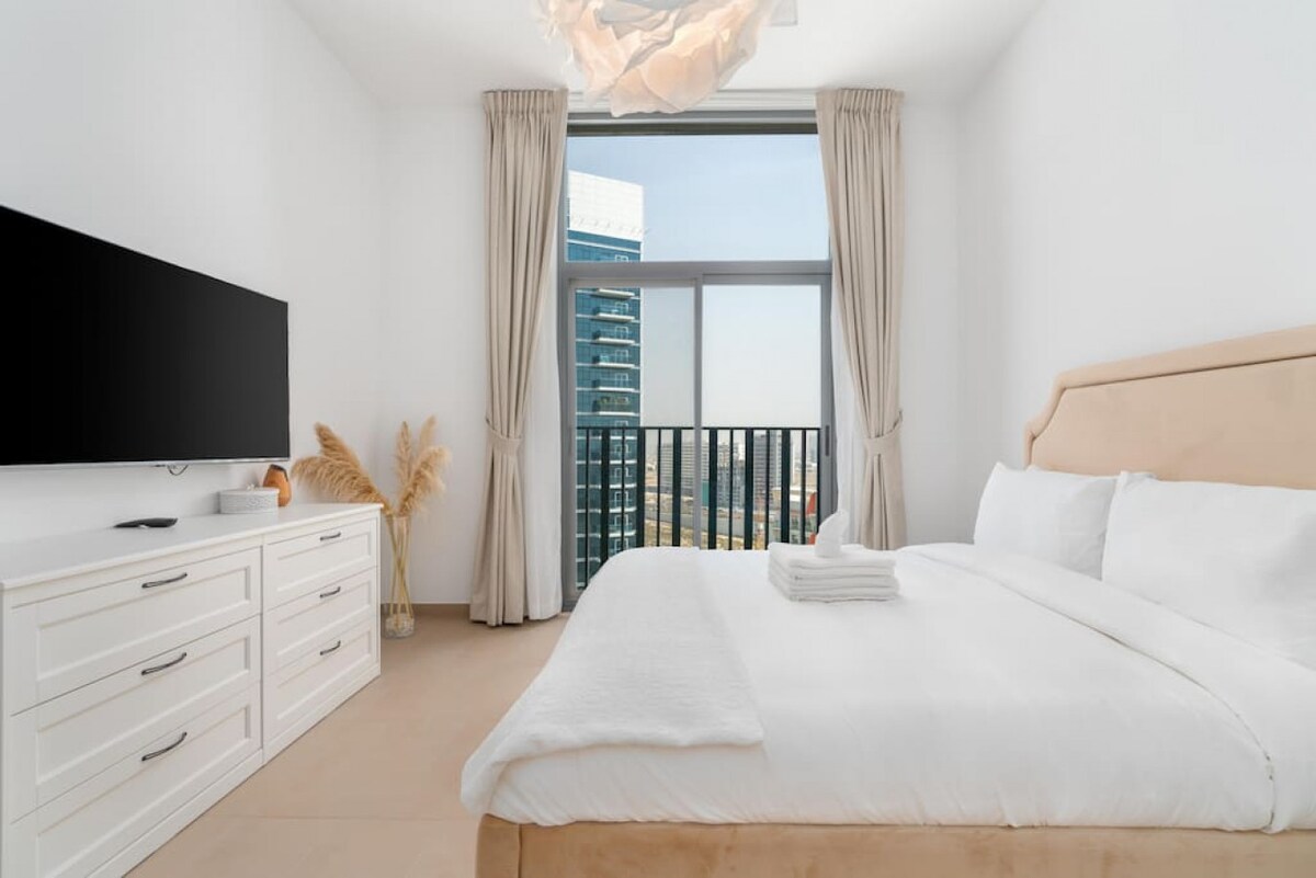 Luxury apartment in District One with Crystal Lagoon and Downtown Dubai views. Located 10-15 minutes away from Burj Khalifa and Dubai Mall. Enjoy walking/running trails, cycling track, kids playground, neighborhood Hamptons Café, and Crystal Lagoon beach access. Relax with a 65” Sony TV, Marshall speaker, fully equipped Miele kitchen, Smeg appliances, and a serene king bedroom with walk-in wardrobes. Bathrooms feature Salt&Mud products. MONTHLY STAYS AVAILABLE, message us for best rates.